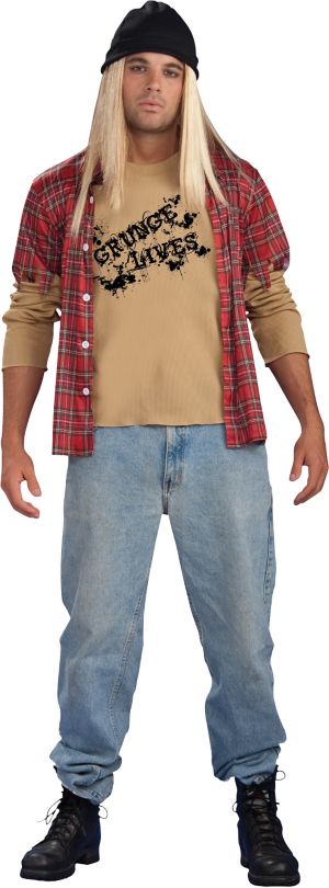 Channel the 90s Seattle grunge scene with a loose flannel shirt layered over a band tee (preferably Nirvana or Pearl Jam), ripped jeans, and worn-out Converse or Doc Martens. Add messy, unkempt hair or a wig and round sunglasses for Kurt Cobain vibes. Accessorize with a beanie or oversized cardigan to complete the thrifted look. The idea is effortless cool with a rebellious edge—clothes that look secondhand and slightly worn-in. This style screams 90s angst, alternative music culture, and an “I don’t care” aesthetic that was hugely popular among teens and twenty-somethings of the decade.