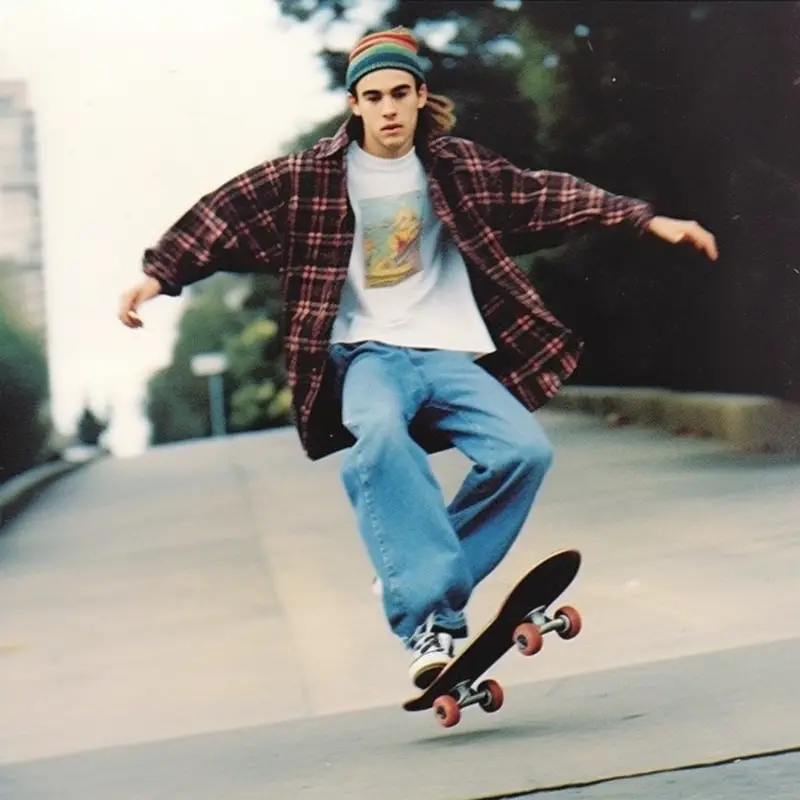 Capture the laid-back, rebellious energy of 90s skate culture. Wear oversized graphic tees, baggy cargo shorts, and Vans or chunky DC sneakers. Add a snapback or beanie and accessorize with a wallet chain. Carrying an actual skateboard (or prop) makes the look feel authentic. Style-wise, it’s loose, comfortable, and effortlessly cool—perfect for channeling Tony Hawk or the countless kids who lived at skate parks. The look represents the counterculture, freedom, and DIY spirit of the 90s youth. It’s casual enough to be comfy but distinctive enough to scream “90s skater vibes” at any party.