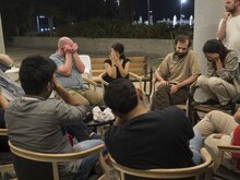 Everyone closes their eyes as the moderator guides the game.
