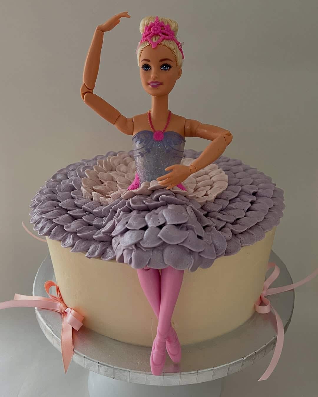 Celebrate dance with a ballet-themed Barbie cake where the cake forms a pink tutu. Add edible tulle, roses, and soft colors like blush, ivory, and pale gold. A fondant ballet slipper or stage base enhances the theme. You can pose Barbie in a ballet stance with a tiara or bun hairstyle. This elegant and delicate design is great for aspiring ballerinas.