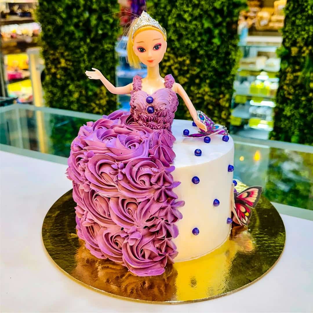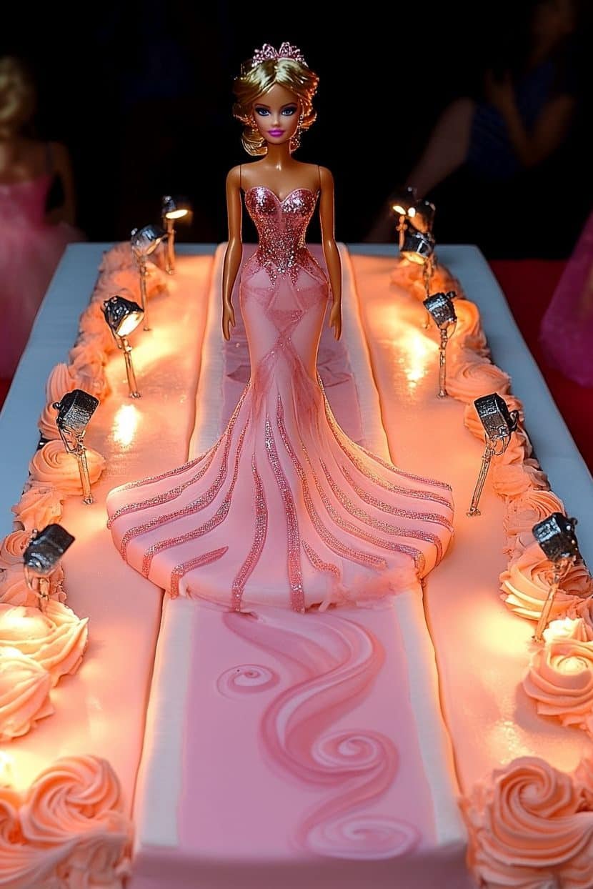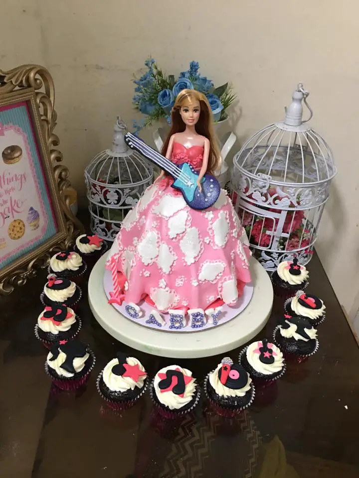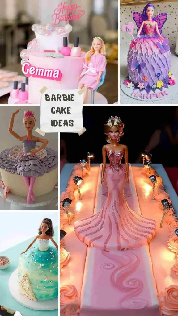 nspired by Barbie’s pop star persona, this cake features a glittery rock-and-roll outfit. Use neon colors, star patterns, edible microphones, and a cake base decorated like a concert stage. The skirt can be made to look like a sparkly tutu or leather outfit. Add musical notes, instruments, or Barbie’s name in a bold, electric font to bring the rock concert vibe to life.
