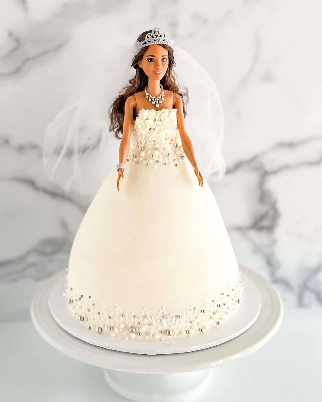 A sophisticated take showing Barbie as a bride. The cake forms a tiered white wedding dress with elegant piping, lace textures, and edible flowers. Accents like a mini veil, bouquet, and pearl necklace add charm. This is ideal for wedding-themed playdates or even as a novelty bridal shower centerpiece. You can make it all white or go for a soft pink or ivory color palette for elegance.