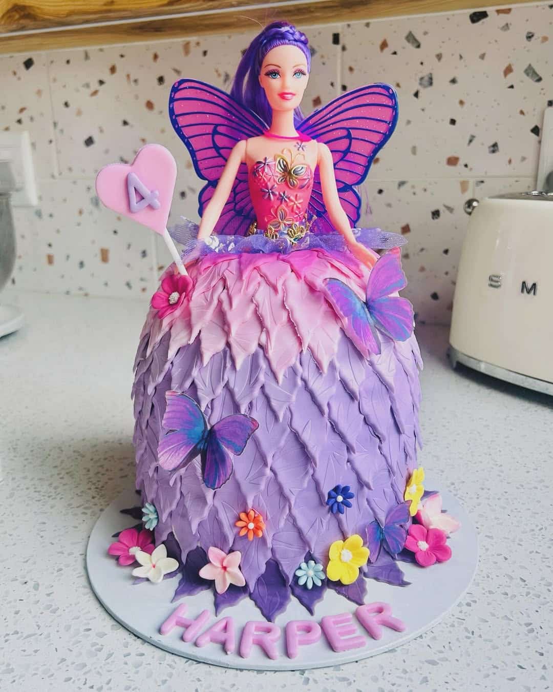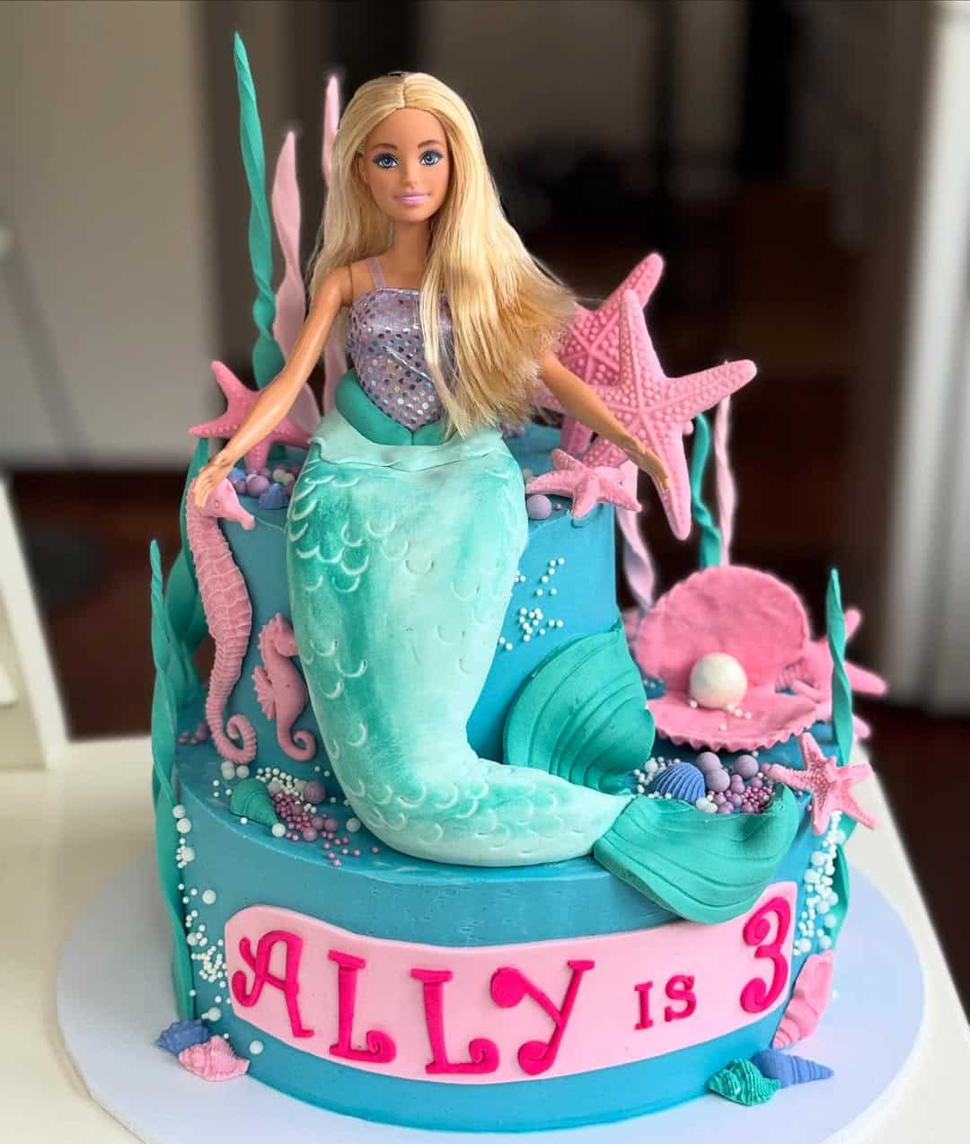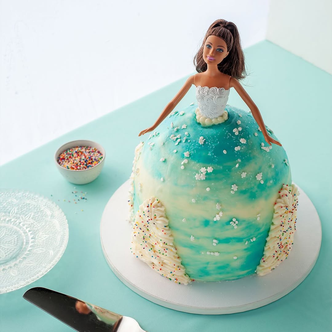 This underwater-themed cake replaces Barbie’s skirt with a flowing mermaid tail crafted from cake and fondant. Scale textures, sea shells, starfish, and coral details make it oceanic and dreamy. Use teal, purple, and shimmering hues to give it an aquatic feel. The base can be decorated like the ocean floor using edible sand (crushed biscuits) and candy pearls. A perfect choice for fans of Ariel or underwater fantasies.