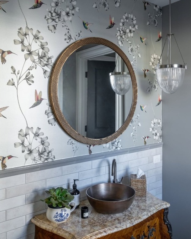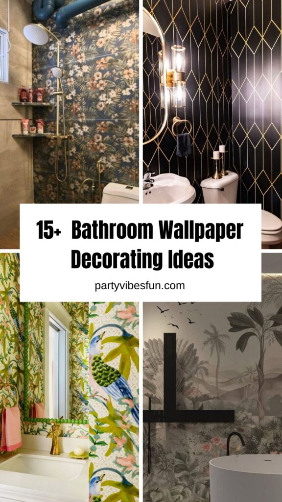 Botanical wallpaper transforms a bathroom into a refreshing spa-like retreat. Featuring lush leaves, tropical plants, or soft florals, this style brings nature indoors and creates a calming atmosphere. Green tones pair beautifully with white fixtures, wood accents, and natural stone finishes. In smaller bathrooms, choose lighter backgrounds with delicate botanical prints to avoid overwhelming the space. For larger bathrooms, bold jungle-inspired patterns can make a striking statement. Moisture-resistant wallpaper is essential to maintain durability. This design works especially well in bathrooms with natural light, enhancing freshness and relaxation.