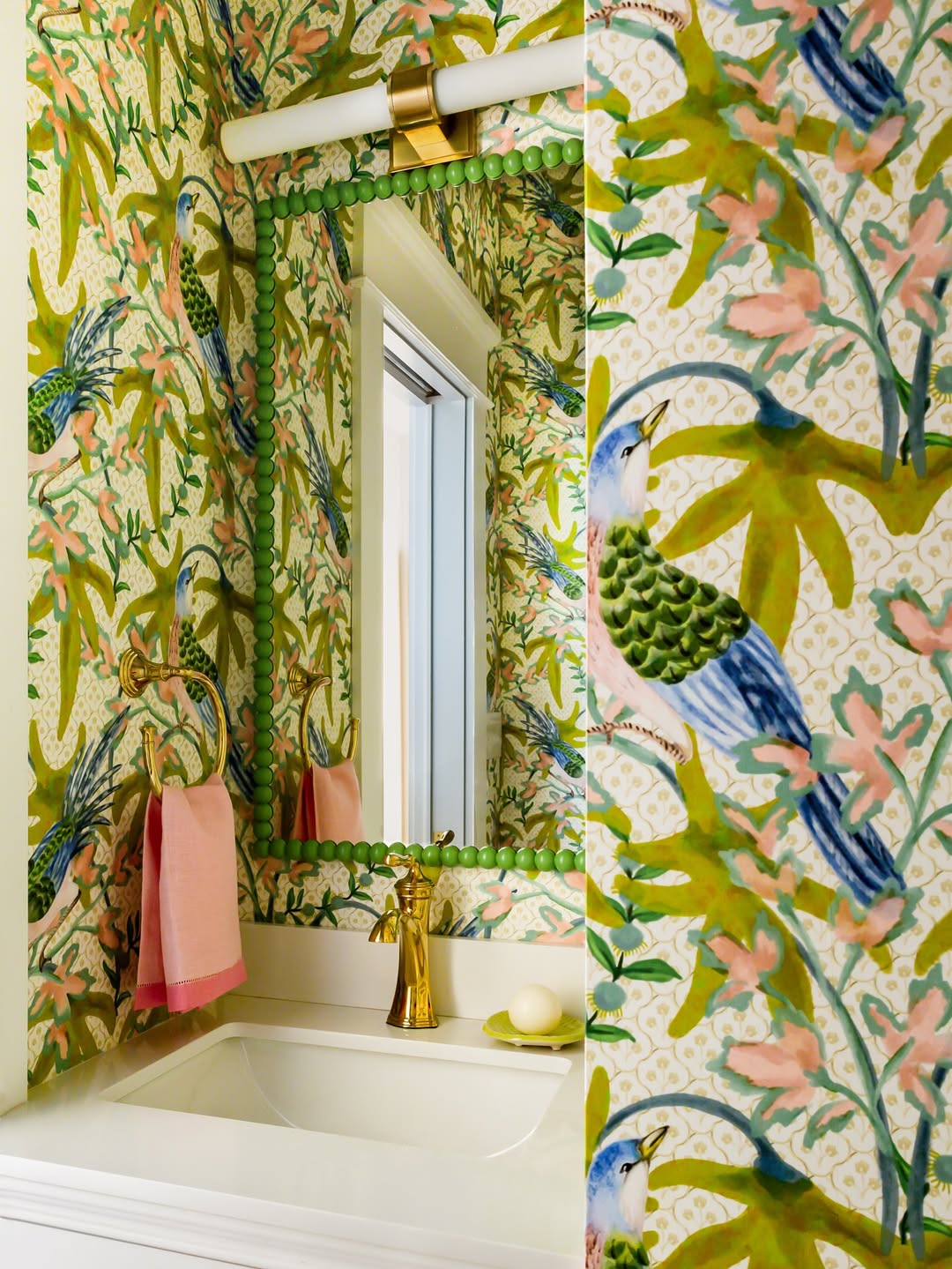 Bold tropical wallpaper introduces vibrant energy and personality into bathroom spaces. Featuring large palm leaves, exotic flowers, or colorful birds, this style creates a dramatic focal point. It works best in powder rooms or guest bathrooms where playful design is welcome. Balance the boldness with simple fixtures and neutral flooring. Choose high-quality, water-resistant wallpaper to handle humidity. Tropical prints turn the bathroom into an eye-catching retreat, perfect for homeowners who enjoy expressive and adventurous interior design.