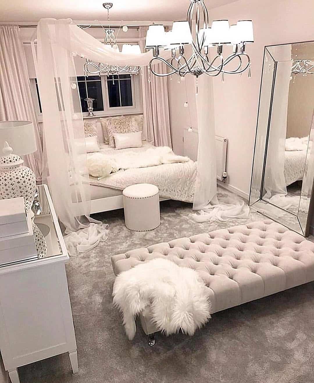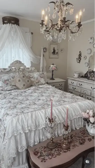 A vintage-style bedroom channels nostalgia and timeless beauty. Choose a soft, romantic palette—blush pink, cream, and antique gold. Use an iron or carved wood bed frame with lace-trimmed bedding. Incorporate antique dressers, ornate mirrors, and chandeliers for elegance. Floral wallpapers or embroidered cushions enhance the romantic theme. Layer delicate fabrics like tulle or silk for texture. Display sentimental pieces—old books, perfume bottles, or framed photographs—to tell a story. The lighting should be soft and warm, adding to the dreamy ambiance. This design exudes charm, grace, and classic sophistication.