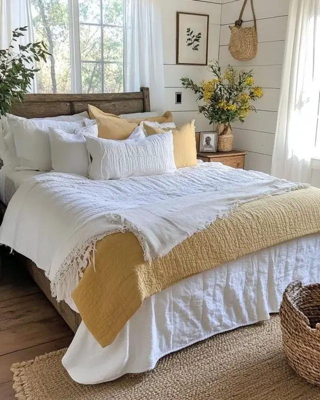 A rustic farmhouse bedroom is cozy, welcoming, and full of charm. Use reclaimed wood furniture, shiplap walls, and distressed finishes for character. Stick to a warm palette of creams, browns, and muted greens. Add layers with plaid blankets, chunky knit throws, and cotton linens. Vintage signs, mason jar lamps, and wrought iron details enhance the farmhouse aesthetic. Incorporate greenery or dried flowers for a natural touch. The mix of old and new creates a nostalgic yet timeless appeal. This space feels like a countryside escape—inviting, warm, and filled with simple, homey beauty.