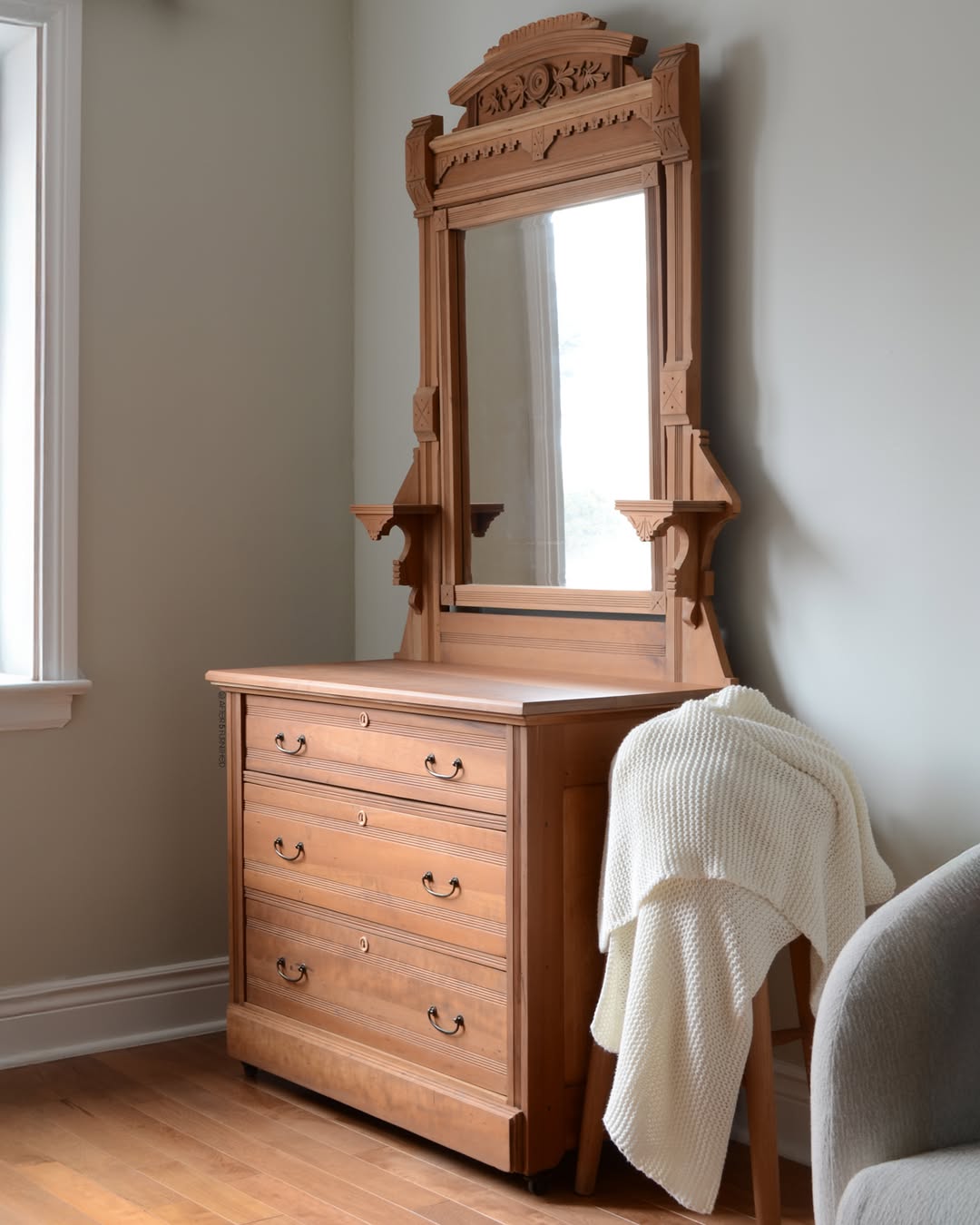 Repurposing a small antique dresser brings character and extra storage to your bedside. With its multiple drawers, it offers far more space than a standard nightstand while adding vintage elegance. The craftsmanship, ornate details, and patina of an old dresser create a timeless look that enhances traditional or eclectic bedrooms. It can also be repainted or distressed for a shabby chic vibe. The generous surface accommodates lamps, books, and decorative accents. This idea works especially well in spacious rooms where you want bedside furniture to make a statement while offering functionality beyond the basics.