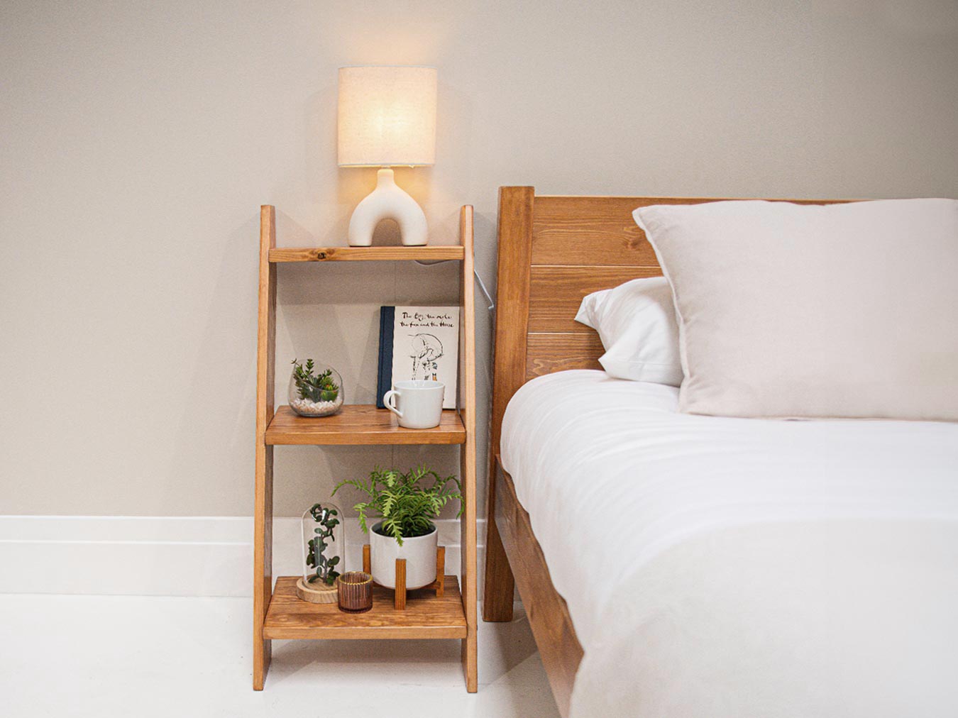 A small ladder shelf can serve as both storage and display beside the bed. Its multiple tiers allow you to organize books, décor, baskets, or even plants while keeping essentials close. Leaning ladder shelves are lightweight and easy to move, making them a versatile choice for renters or frequent redecorators. This idea works well in modern, Scandinavian, or boho bedrooms where functionality and style meet. Choose a slim, tall ladder for tight spaces or a wide one for added storage. With its vertical design, it maximizes space and brings an organized, stylish look to your bedside area.
