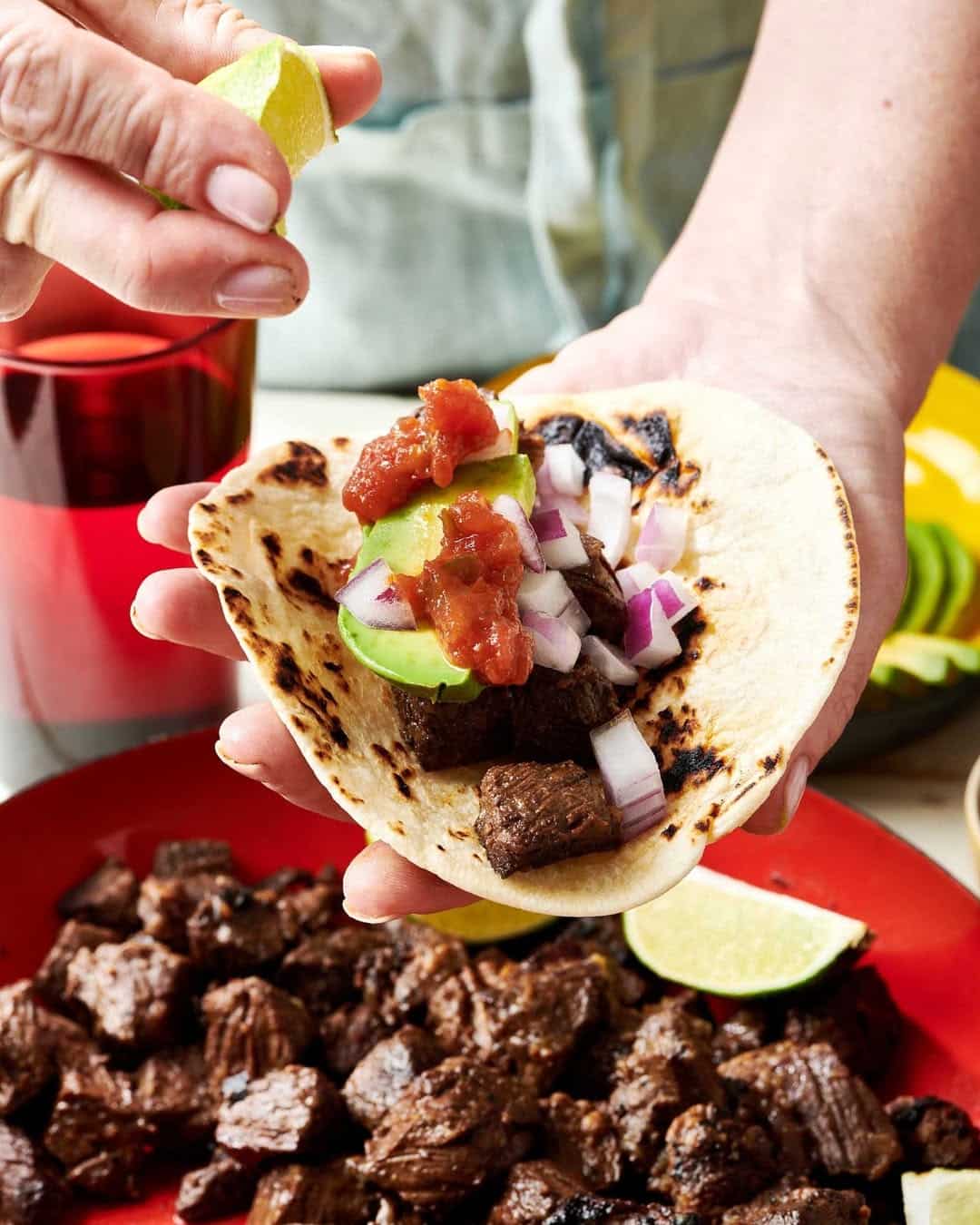 Flavorful beef cubes seared with spices, tucked into soft tortillas with toppings.