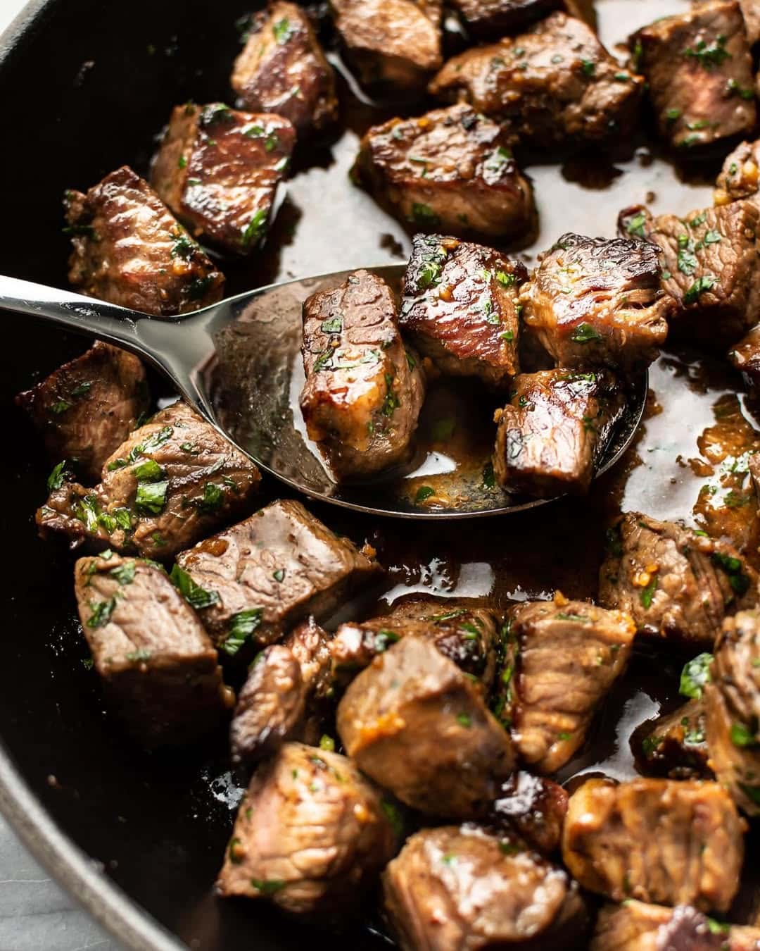 Return beef cubes to the skillet and toss to coat in garlic butter.