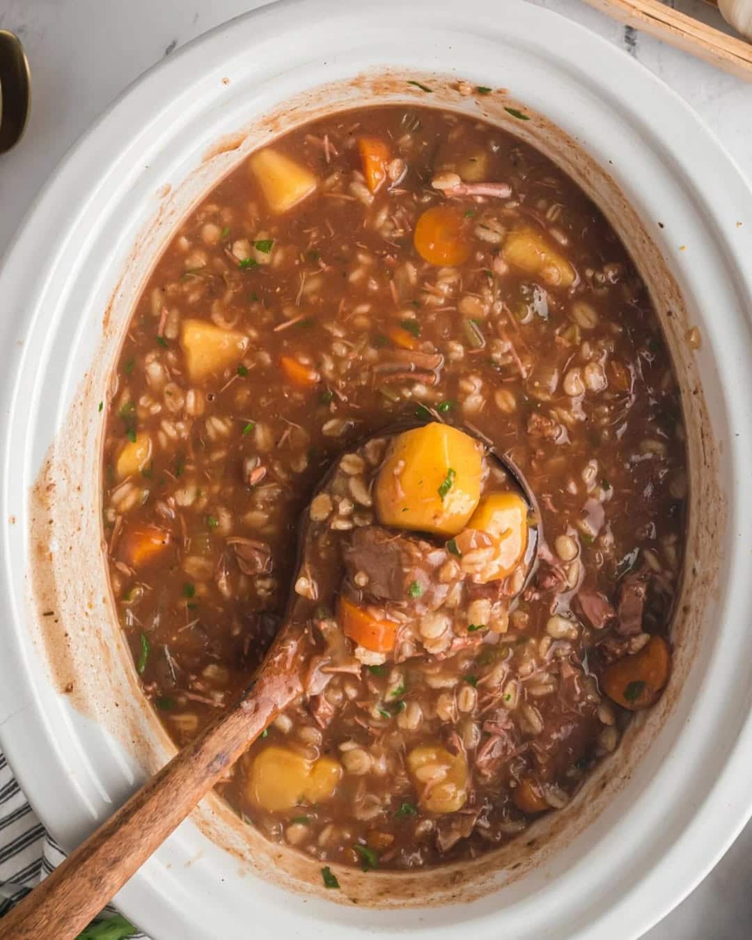 Cook on low for 7–8 hours or high for 4–5 hours until beef is tender and barley is cooked.