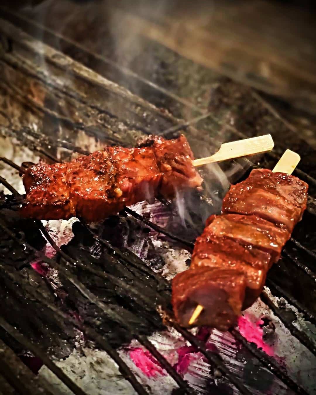 Grilled skewers of marinated beef cubes with a spicy kick, perfect for barbecues.