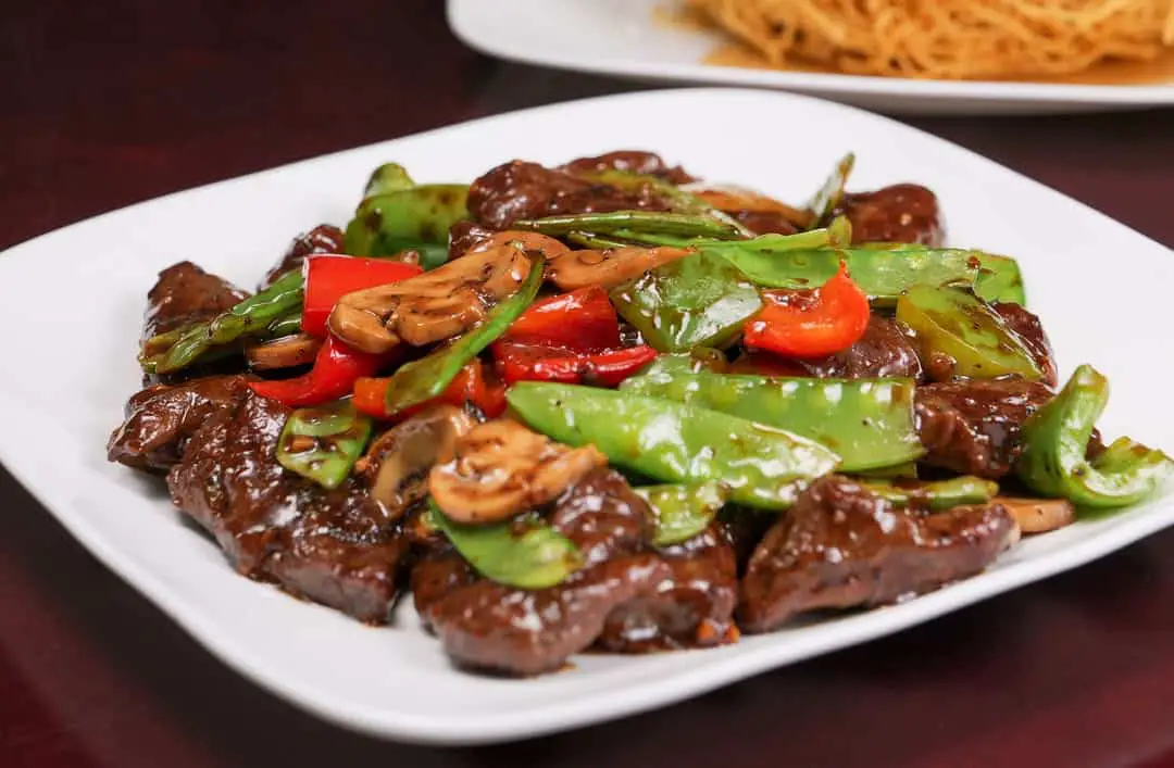 Quick and colorful dish with beef cubes, bell peppers, and soy-based sauce.