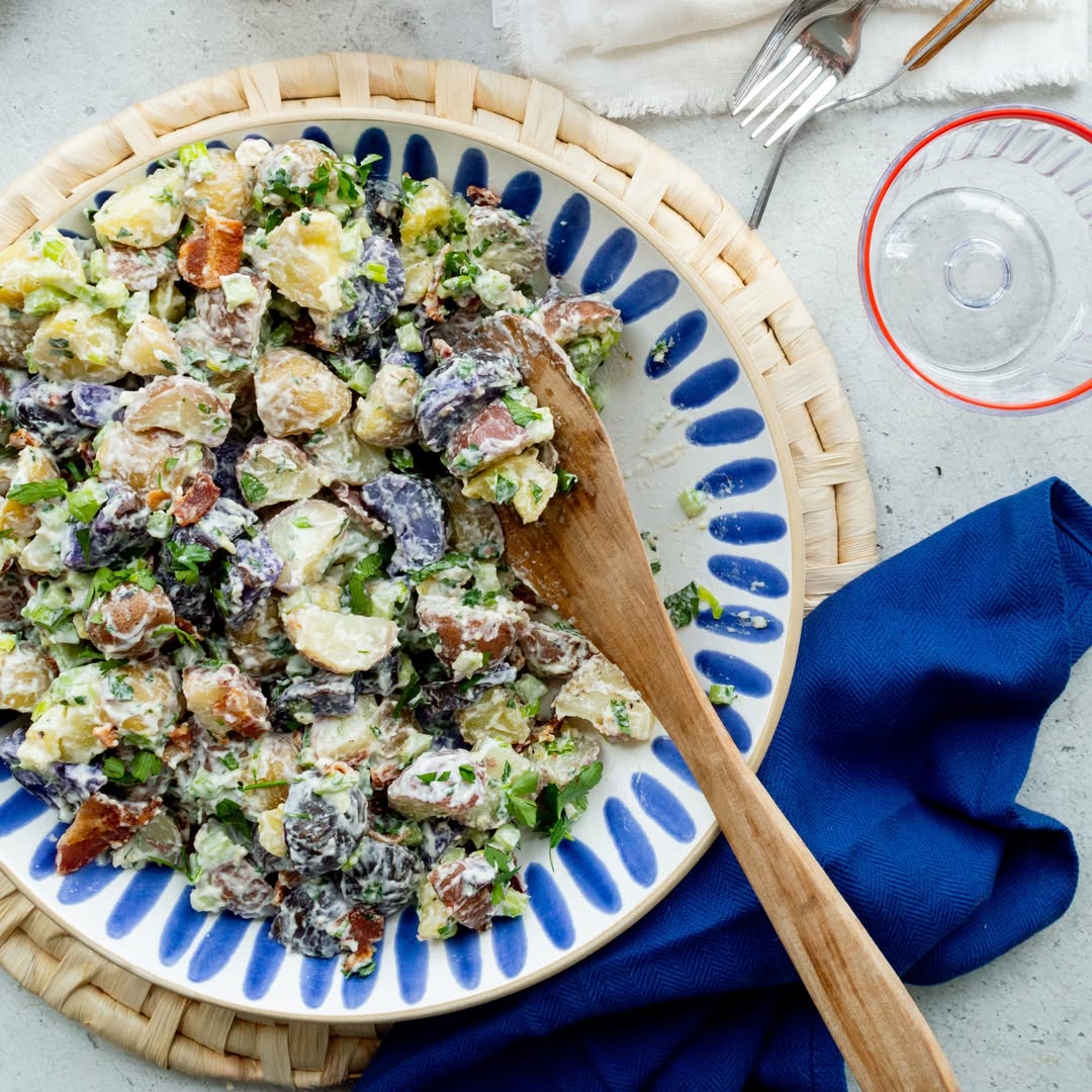 A creamy potato salad with crispy bacon and tangy blue cheese crumbles for a bold twist.