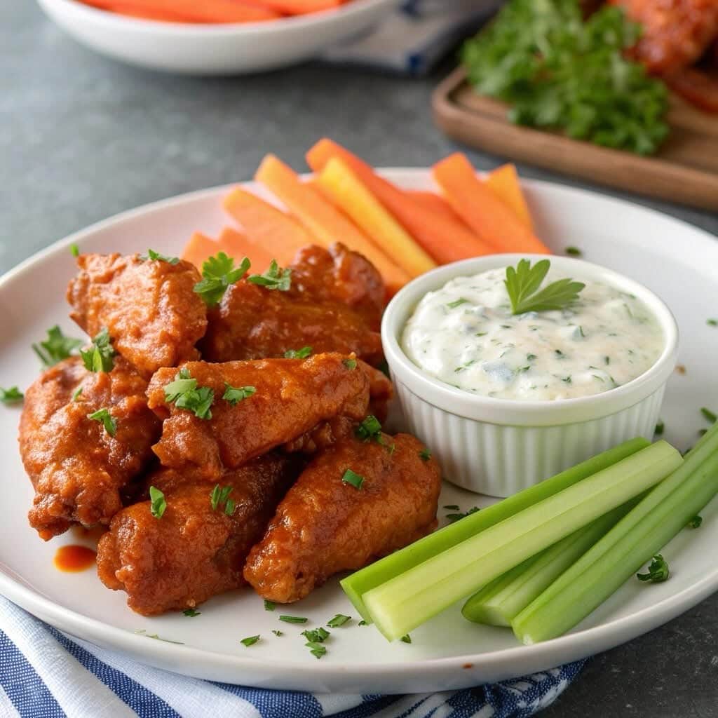 Classic spicy buffalo wings paired with a cooling, creamy blue cheese dipping sauce.