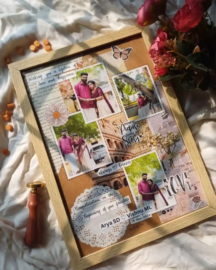 Create or purchase a beautiful scrapbook or wedding planner. This can help the bride keep track of her wedding journey or collect memories along the way. Include photo slots, journaling prompts, planning checklists, and envelopes for keepsakes like invitation samples. A handmade or customized version adds sentimental value and shows effort. This is a perfect blend of organization and emotion, especially for brides who love to document special moments.