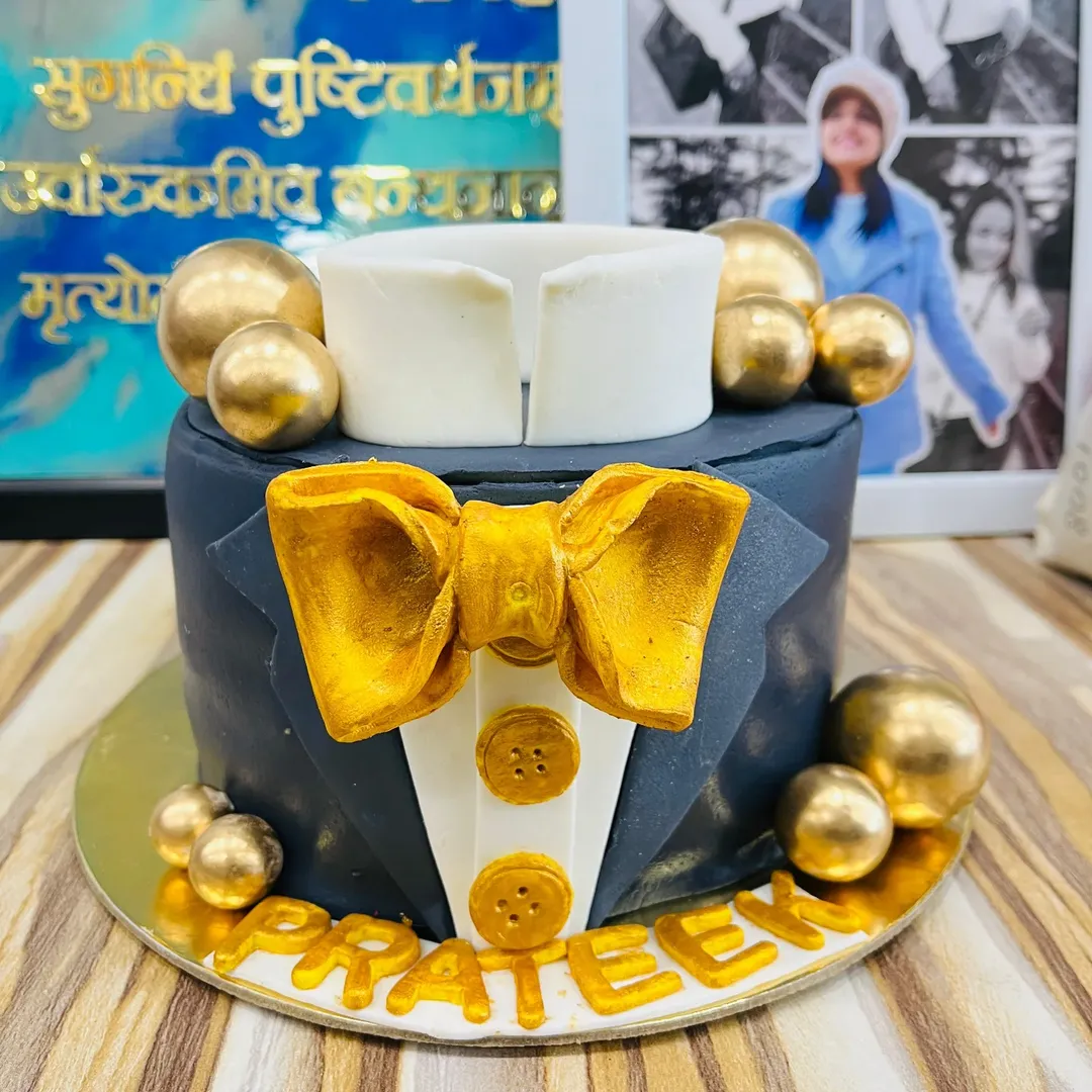 A stylish cake imitating a tailored tuxedo or formal suit.