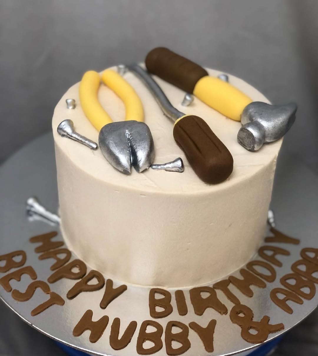 Finish with fondant nails or metal-effect accents to enhance the masculine woodworking theme.