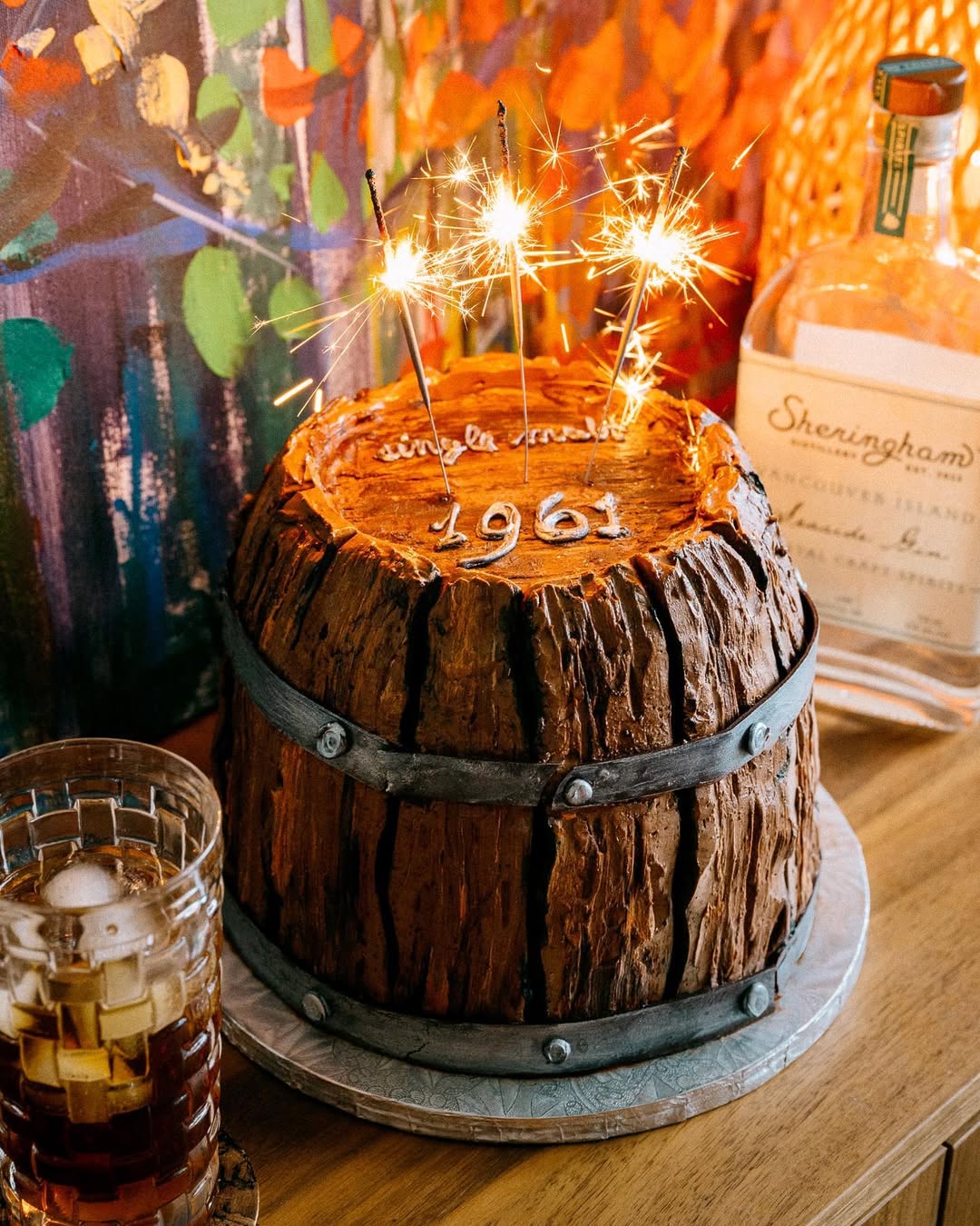 A cake styled like an aged whiskey barrel with deep wooden textures and metal banding.