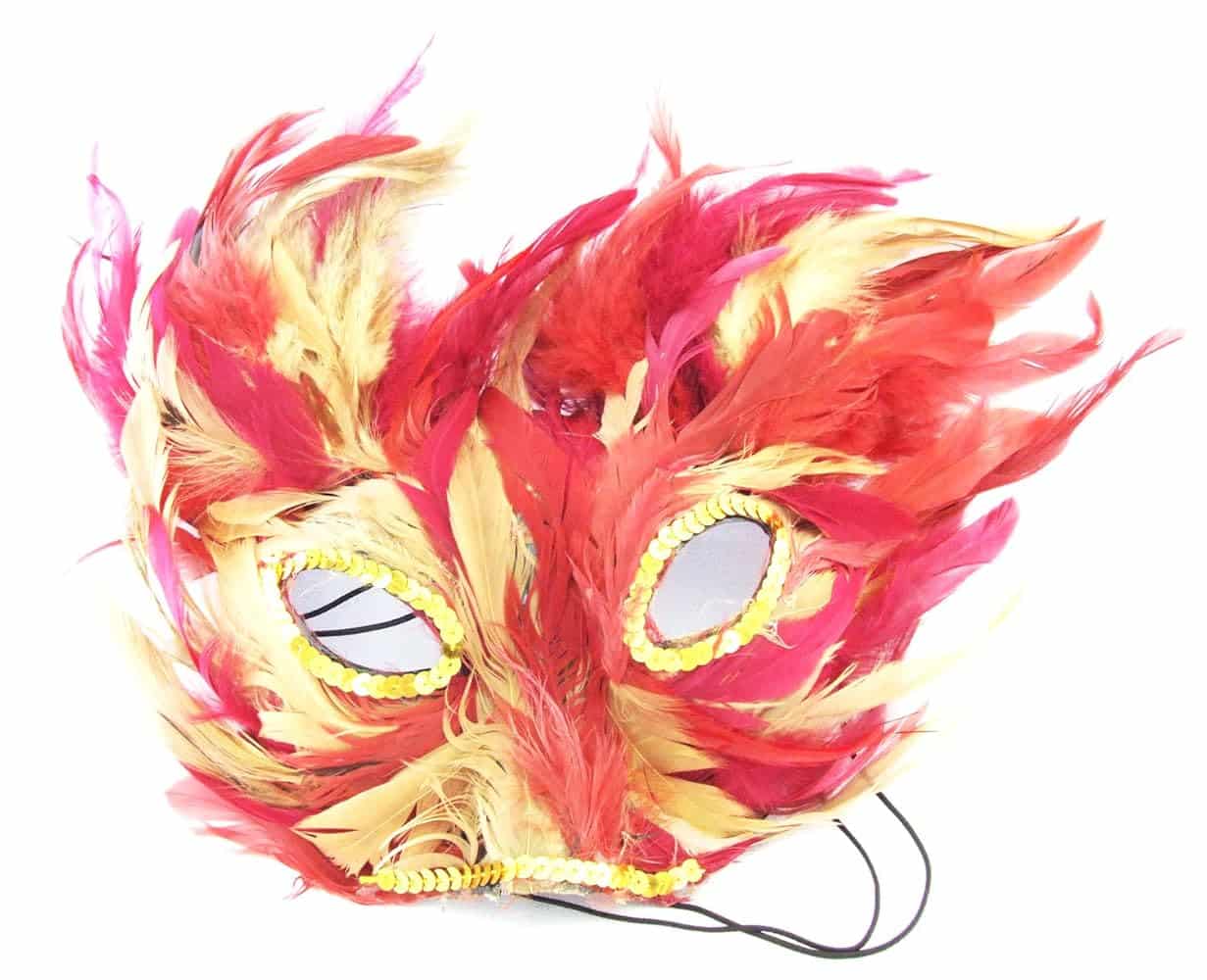 A flamboyant design for Mardi Gras or carnival parades. The mask is covered in colorful feathers—purple, green, gold, or rainbow. Rhinestones and metallic paints add more vibrance. Long feathers can extend from the ears for dramatic height. Paired with festive outfits and beads, this mask turns any wearer into a dazzling carnival character.