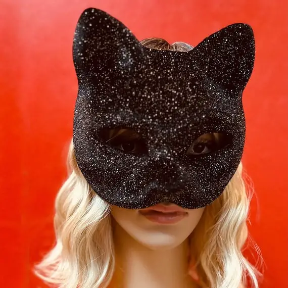 A sparkling, eye-catching cat mask designed for festive events. The base is made from sturdy cardboard or molded plastic, covered in glitter—gold, silver, or even holographic shades. You can outline the eye holes with rhinestones for extra shine. This style works well for New Year’s Eve, dance parties, or stage performances. A metallic ribbon tie adds a luxurious touch. Pair it with matching sequined clothing for a bold fashion statement. The glitter effect catches light beautifully, making the wearer stand out in photographs and under spotlights.