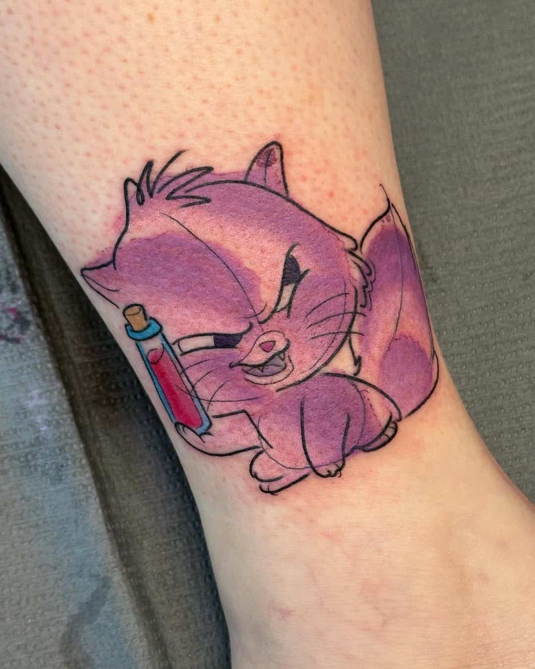 This style mimics the flowy, dreamy look of watercolor paintings. The design can feature a cat in realistic form or as a whimsical sketch filled with vibrant splashes of pink, blue, or purple. Watercolor tattoos have no strong outlines, making the edges blend seamlessly into the skin. This gives the tattoo a soft, artistic, and magical feel. The colors can represent emotions or personal meaning—such as blue for calmness or pink for affection. A watercolor cat tattoo works beautifully on the upper arm, thigh, or back, creating a visually striking yet artistic piece.