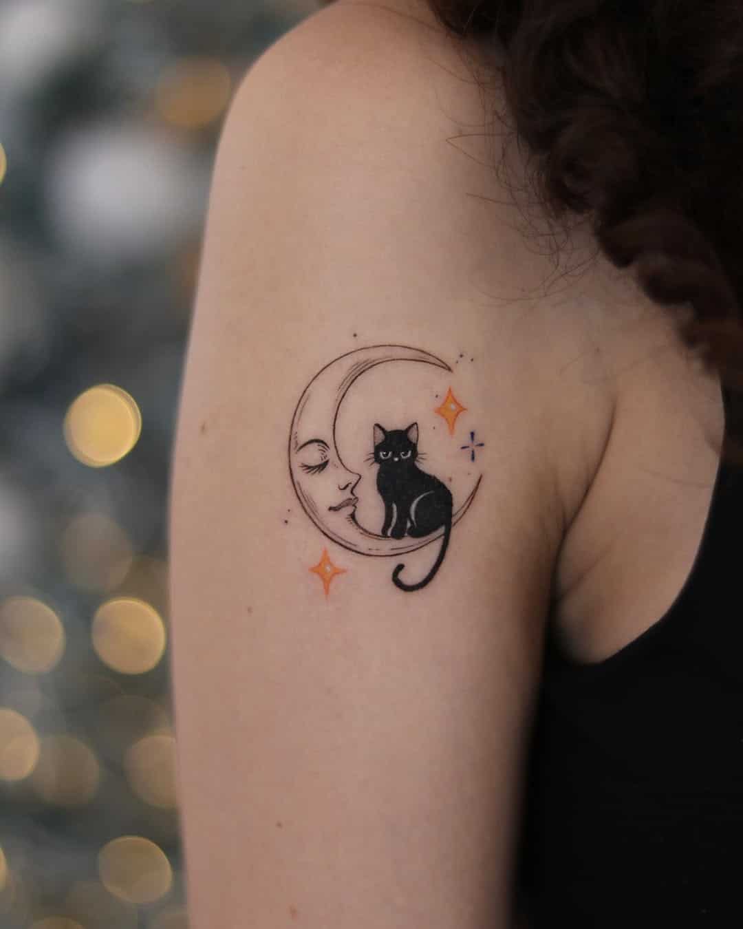 This design merges feline elegance with celestial beauty. It can depict a cat sitting on a crescent moon or gazing up at a starry sky. Symbolically, cats are linked to mystery, magic, and the night—making the moon a fitting companion in the tattoo. This style can be done in silhouette, line art, or full color with galaxy-like backgrounds. The moon phase can also hold personal meaning, such as a crescent for growth or a full moon for completeness. This tattoo works beautifully on forearms, backs, or thighs.