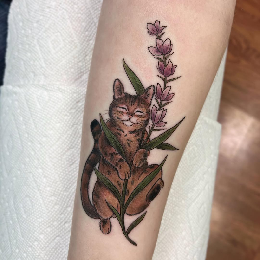 A floral cat tattoo incorporates flowers into the cat’s design—either as a background, surrounding frame, or integrated into the body. For example, the cat’s silhouette can be filled with roses, lilies, or cherry blossoms. This style blends nature’s delicacy with feline grace, creating a soft and beautiful piece. Different flowers carry different meanings—roses for love, lilies for purity, or sunflowers for happiness. The combination can be realistic, watercolor, or illustrative. This tattoo is perfect for those who want something both elegant and symbolic.