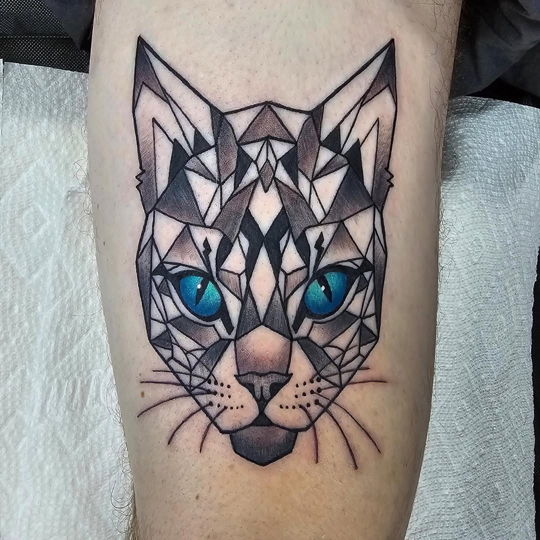 Geometric cat tattoos combine sharp lines, triangles, and polygons to form the cat’s face or body. This modern style gives the design a contemporary, almost futuristic vibe. It can be symmetrical for a balanced look or intentionally abstract for artistic flair. Some people choose to keep the design monochrome, while others add color gradients for depth. Geometric tattoos can represent order, logic, and balance—attributes you may associate with cats. They are especially striking on the forearm, calf, or shoulder, where the geometric lines can be displayed fully.