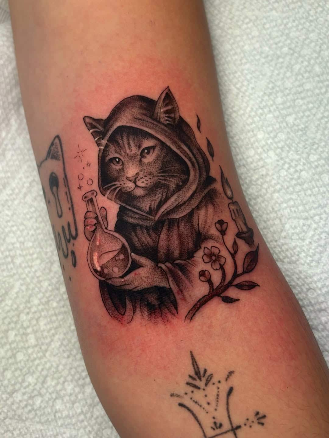A mystical cat tattoo often portrays the cat with magical elements—like a third eye, glowing or starry eyes, or surrounded by mystical symbols such as runes and constellations. This style draws inspiration from cats’ long history in myths and folklore as mysterious, spiritual creatures. It can be designed in black-and-grey for an eerie look or vibrant colors for a fantasy vibe. Mystical cats symbolize intuition, independence, and spiritual guidance. Popular placements include the upper arm, thigh, or back, where the details can shine.