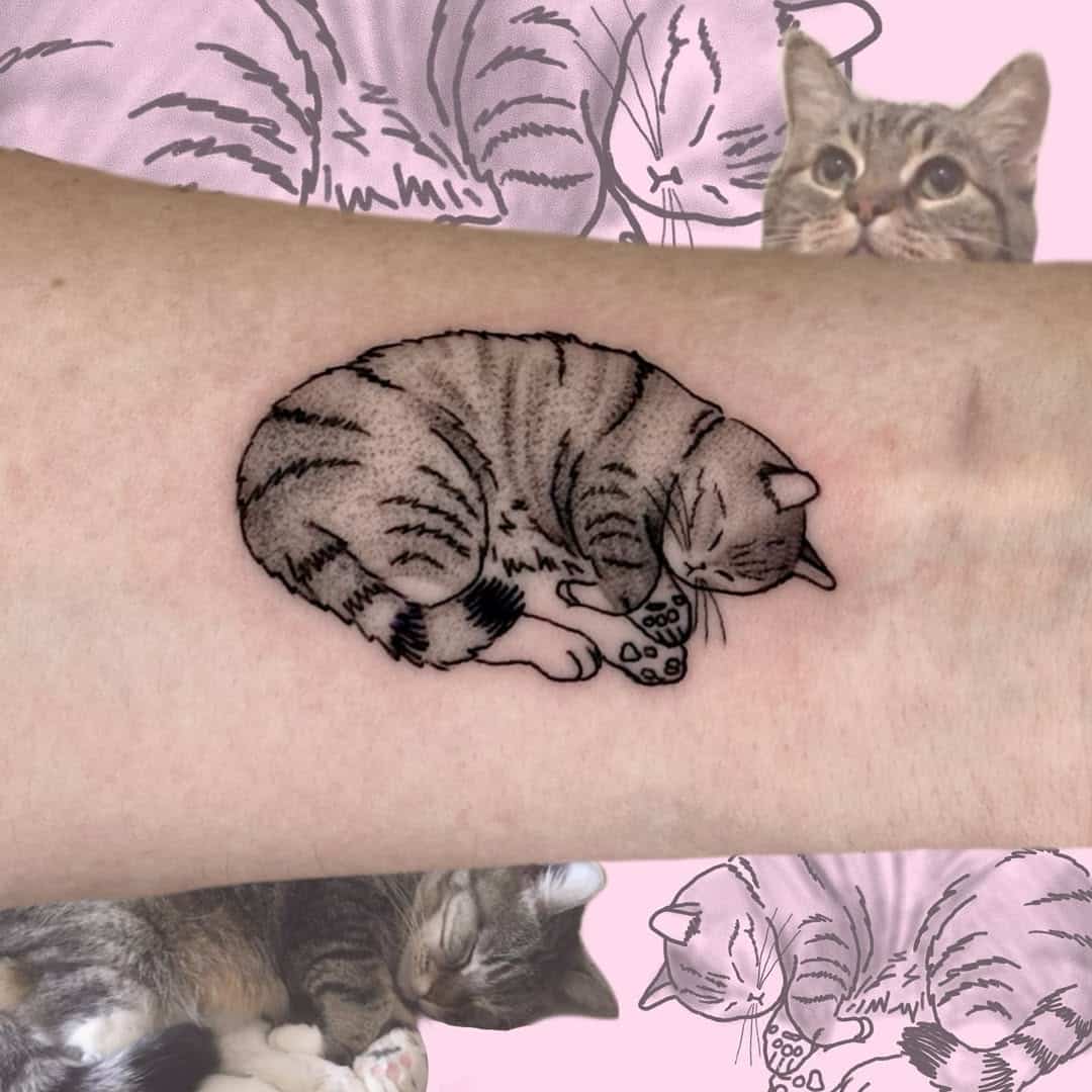 A sleeping cat tattoo symbolizes peace, comfort, and warmth. The design can show the cat curled into a crescent shape or stretched out in a cozy pose. It can be done in minimalist outline form, realistic shading, or even a cartoon style. Some choose to place this design near the heart or ribcage to represent emotional closeness. A sleeping cat tattoo can also be paired with small symbols—like stars, moons, or flowers—to add personality. It’s a comforting choice for those who want to carry a sense of calm and love with them always.