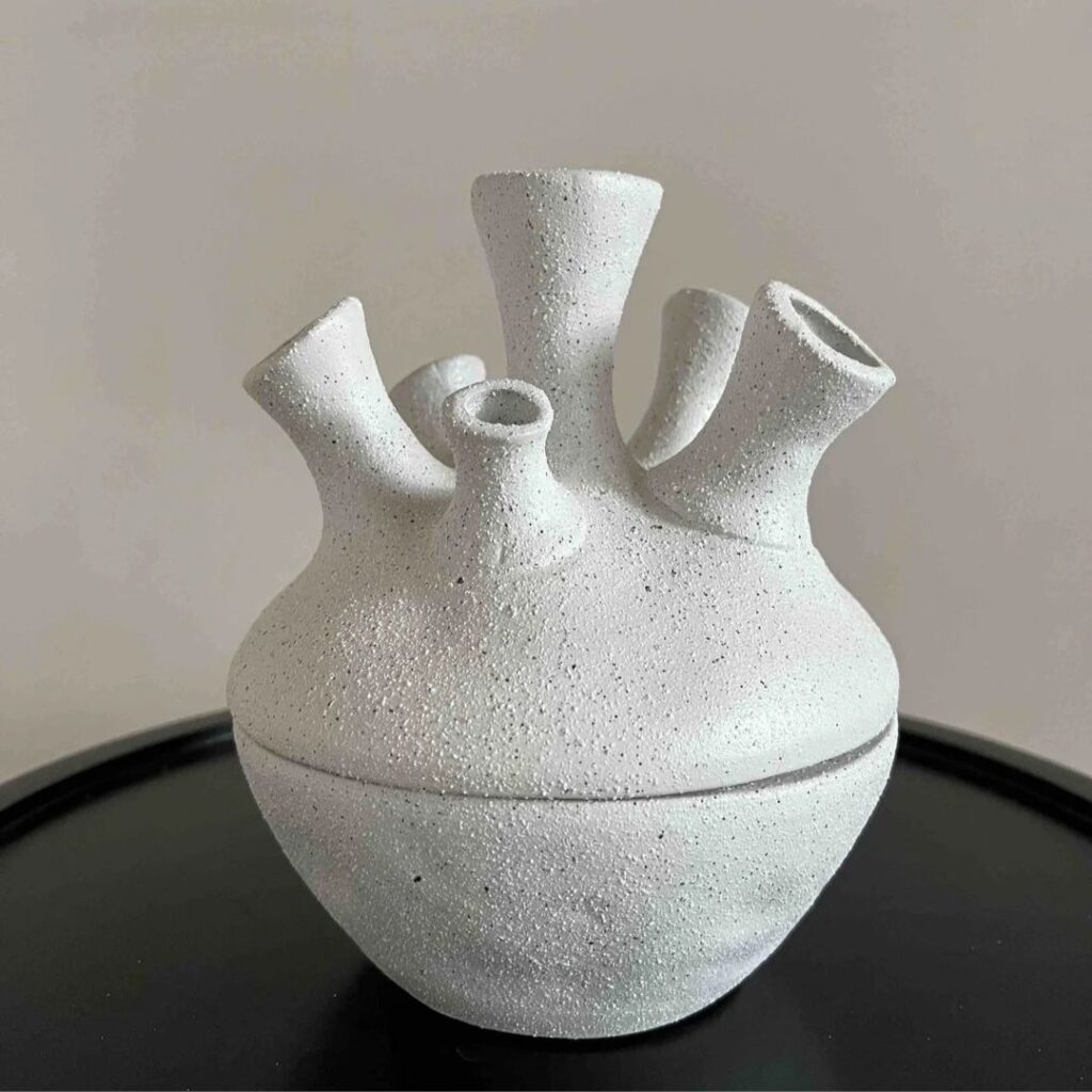 A multi-opening ceramic bud vase features several small necks connected to one base. Each opening holds a single stem, allowing you to arrange flowers in a playful, balanced way. This design encourages creativity, as you can mix different blooms or greenery. The vase itself often has a compact, sculptural form. It’s perfect for desks, bedside tables, or small spaces. Even a few garden clippings look intentional in it. This vase turns simple stems into a curated display and makes flower arranging feel effortless and modern.