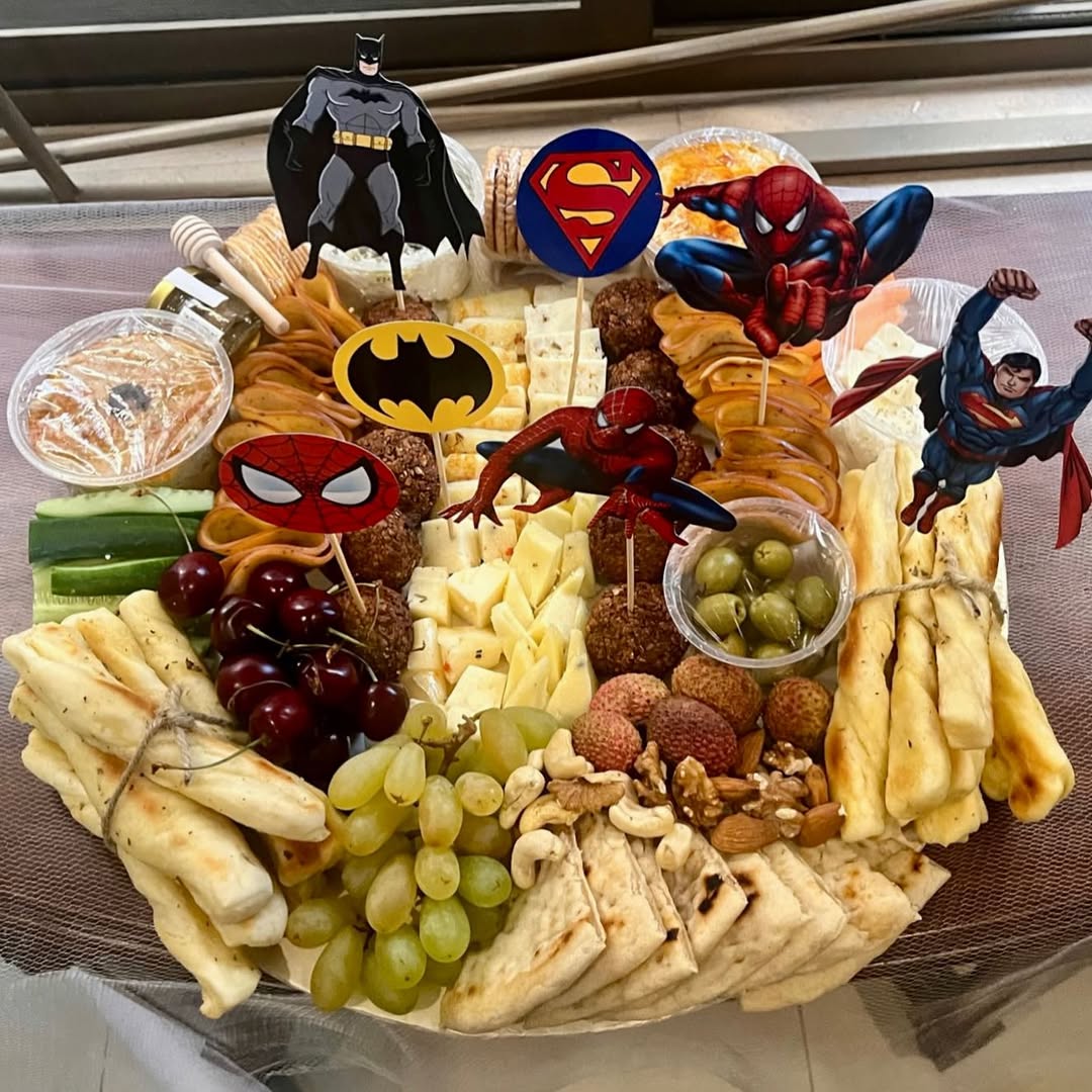 A playful, colorful platter designed for children, featuring mild cheeses and fun finger-food add-ons. Safe, simple, and visually inviting.