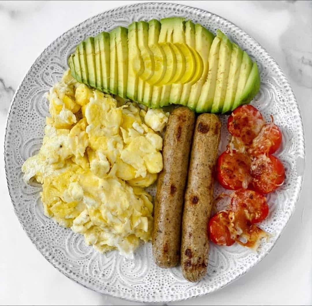 A wholesome breakfast with scrambled eggs, chicken sausage, and fresh veggies for a protein-packed start to the day.