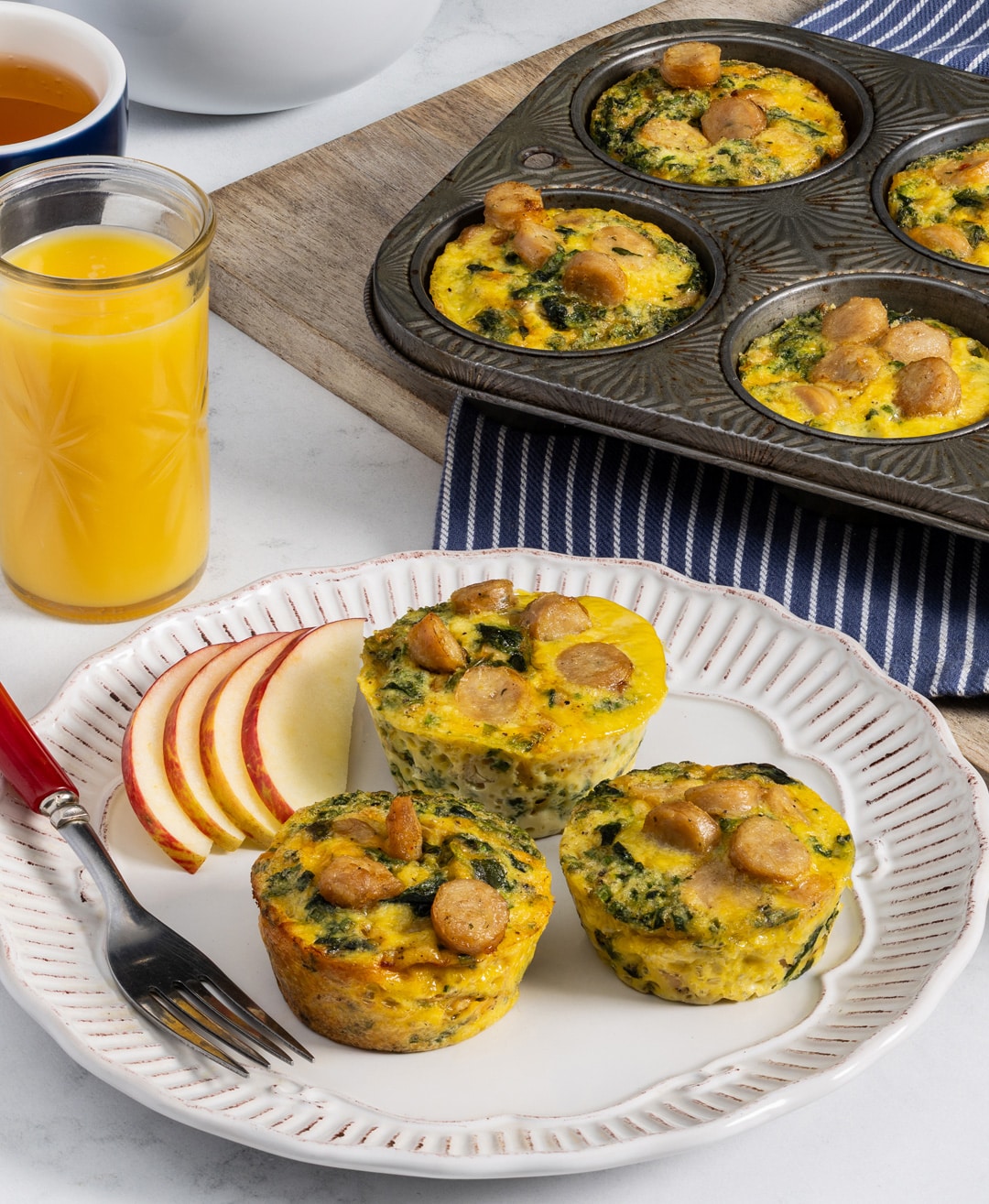 3. Fill Muffin Cups: Add chopped sausage, spinach, and tomato evenly.