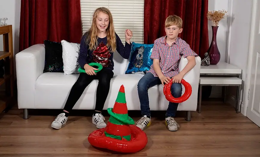 A jolly toss game where players aim rings over cone-shaped elf hats for points and prizes.