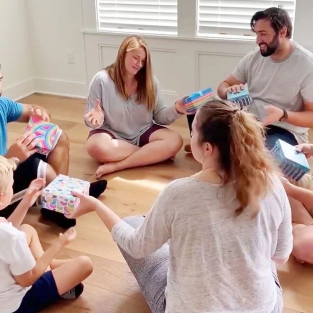 At the end, everyone opens the gift they are holding, making the final reveal exciting.