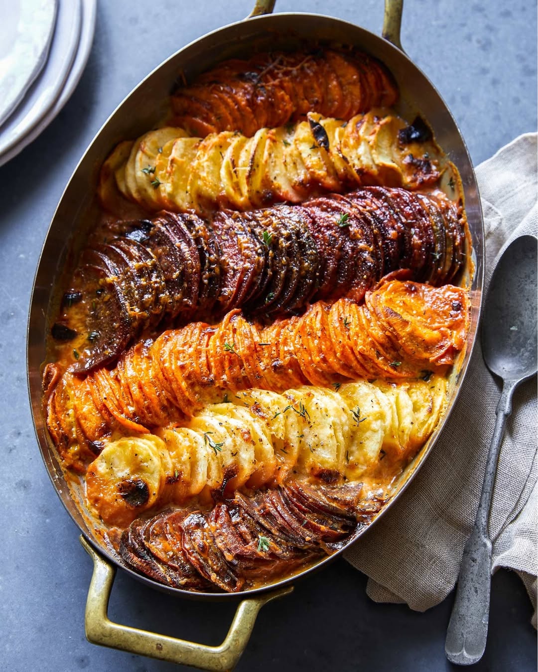 A cozy layered casserole of root vegetables baked in creamy sauce with a crisp, cheesy top.