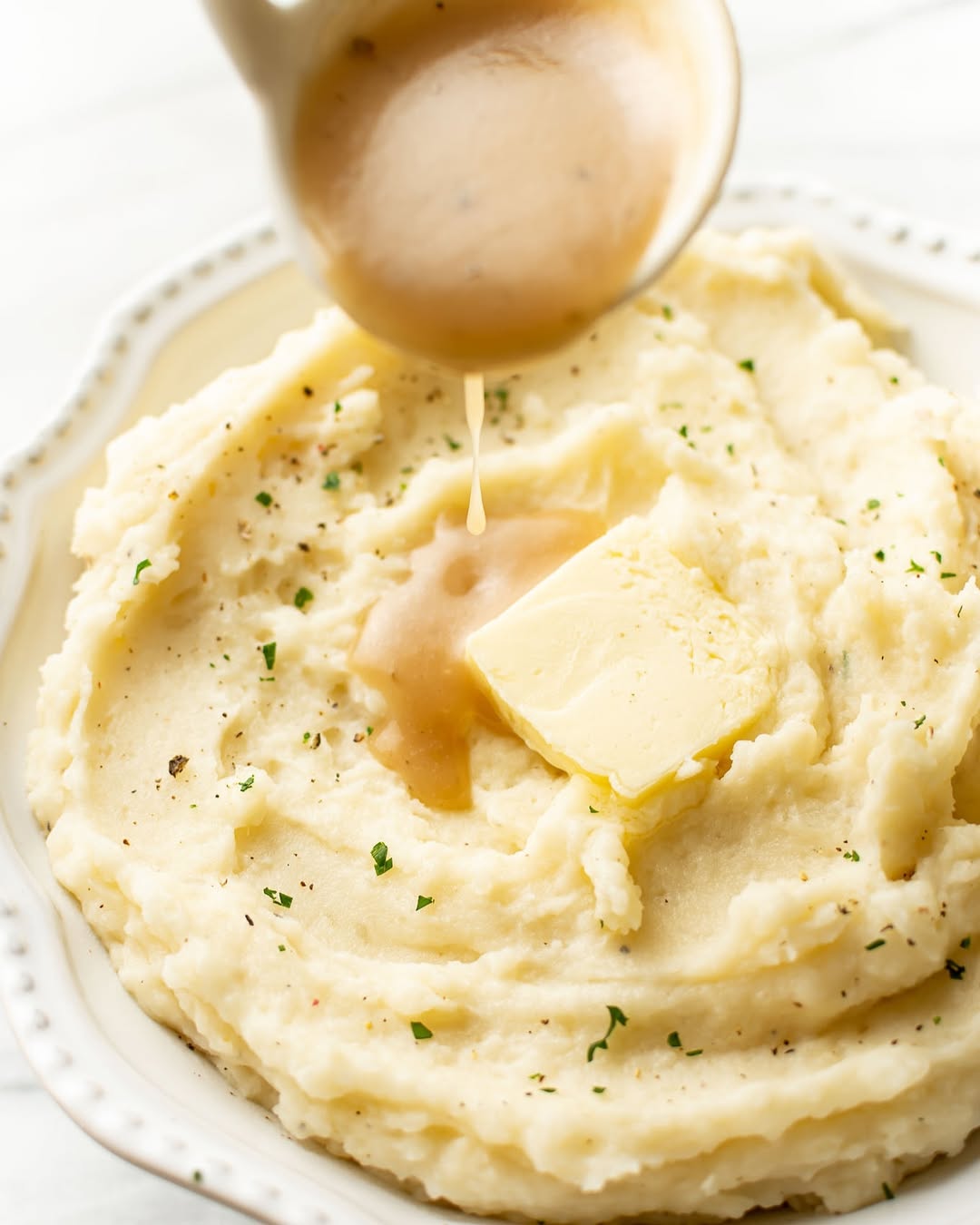 Soft, buttery potatoes whipped with warm cream and roasted garlic for a decadently smooth holiday side.