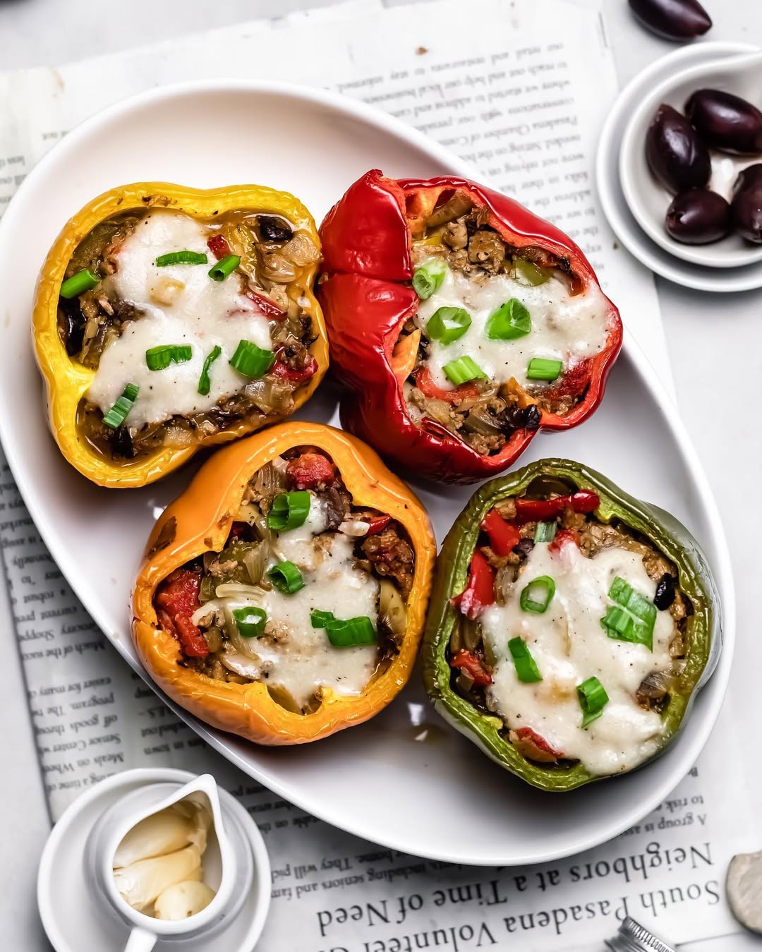 Colorful red and green peppers stuffed with seasoned rice, vegetables, and tender crab or beef for a festive look.