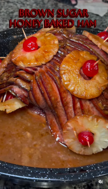 A festive ham coated in a shimmering honey-brown sugar glaze that caramelizes beautifully in the oven.