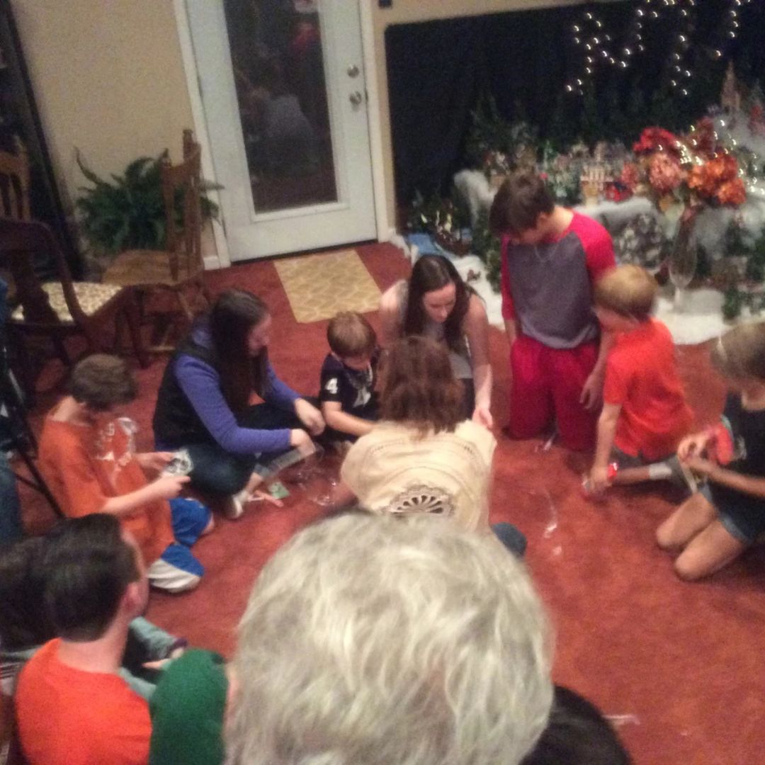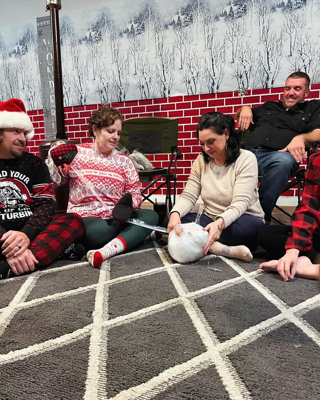 Add charades prompts related to Christmas movies, songs, and traditions between wrap layers.