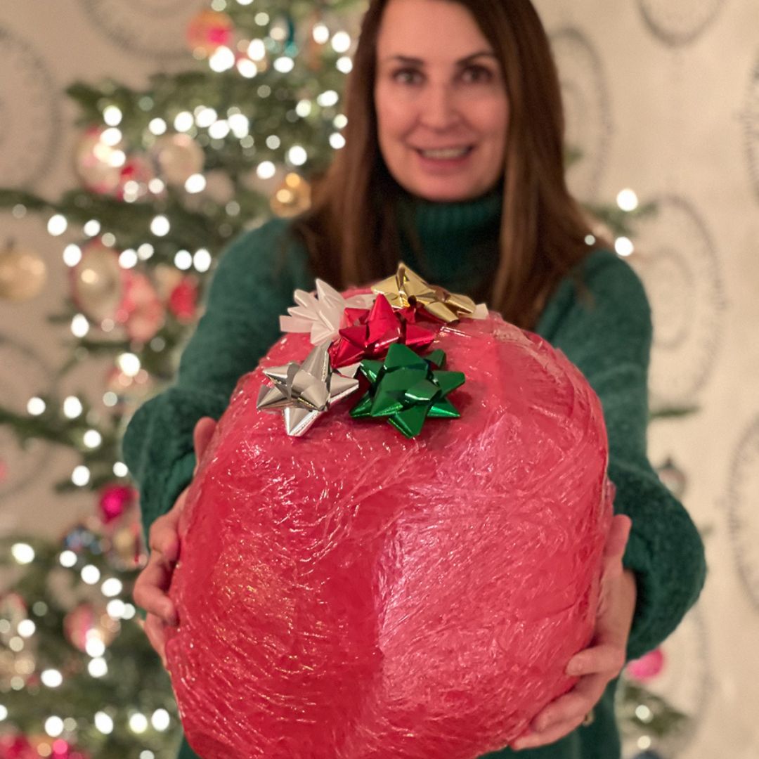 Fill the ball with stocking stuffer gifts such as lip balm, keychains, chocolates, socks, and holiday trinkets.