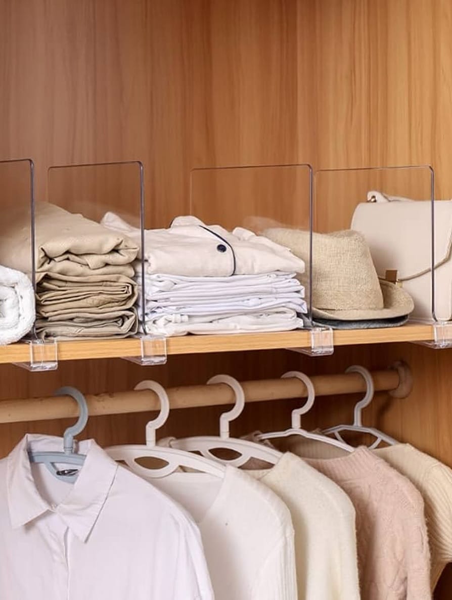 Closet shelves often turn into messy piles of clothes. Shelf dividers help keep stacks of sweaters, jeans, or t-shirts neat and upright. These dividers act like bookends, preventing garments from toppling over. Clear acrylic dividers look modern and let you see everything easily, while wire ones provide a more budget-friendly option. They can also be used for handbags, clutches, or hats. If you adjust shelf heights, you can customize them for larger or smaller items. This idea is especially useful for open shelving where a tidy, structured look makes the closet feel more intentional and stylish.