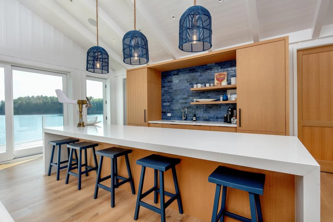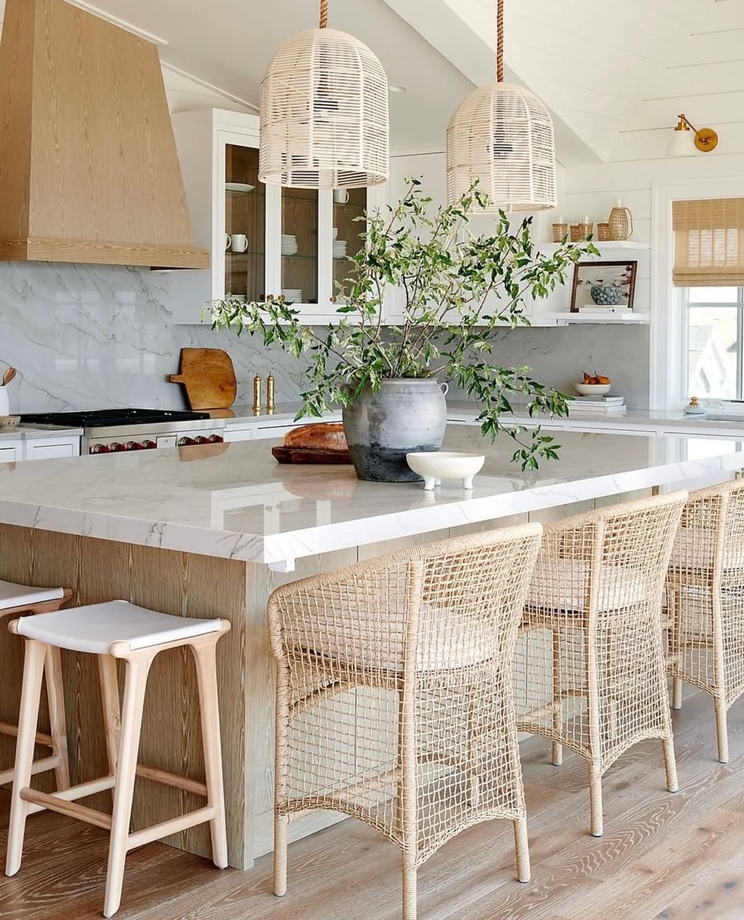 A fresh, breezy interpretation of contemporary design, coastal kitchens use soft blues, whites, and sandy neutrals to evoke calm seaside tones. Light wood floors, rattan textures, and natural stone surfaces give the space warmth and organic charm. Keep lines clean and cabinetry modern, avoiding ornate details while still embracing comfort. Large windows, glass pendant lights, and open shelving maintain brightness and openness. Incorporate subtle beach-inspired décor—ceramic vases, textured baskets, or sea-glass accents—to complete the look without feeling theme-heavy. This style is perfect for homeowners seeking a relaxed yet modern environment.