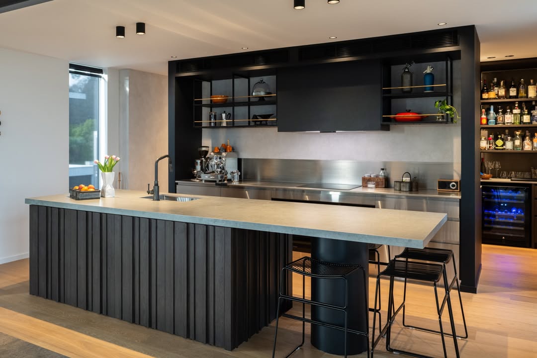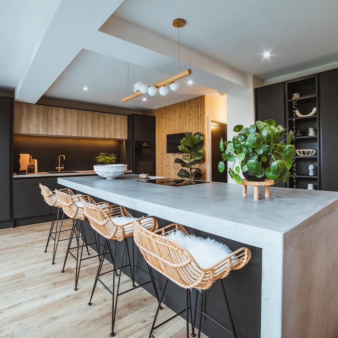Blending natural wood textures with matte black elements creates a bold yet inviting contemporary kitchen. Wood brings warmth and organic character, while black delivers crisp modernity. Use black for cabinetry frames, fixtures, or appliances to create striking contrast. Opt for light oak, ash, or walnut to maintain balance and avoid a heavy feel. Integrated LED strip lighting under upper cabinets softens the darkness, making the space glow in the evening. This style works beautifully with open shelving, allowing the tones of wood to shine while the black background adds depth and definition.