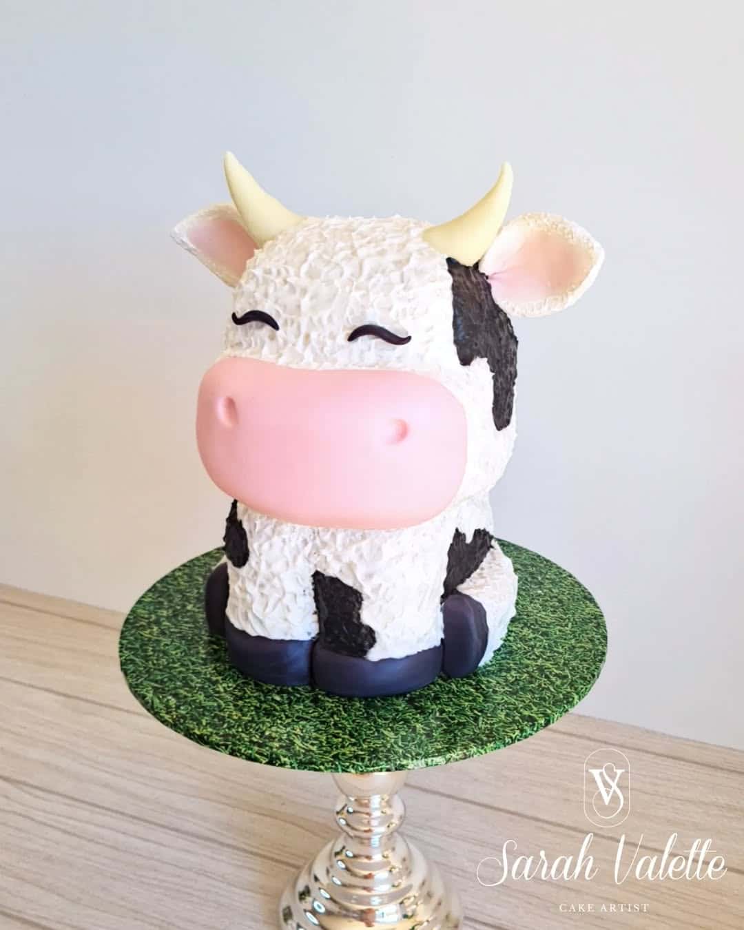 A showstopper cake shaped like a full 3D cow, crafted with sculpted cake layers and covered in fondant for realism. The cow can be standing or sitting in a cartoonish style with big eyes and a friendly smile. Chocolate cake works well for structural stability, paired with buttercream layers. Details like a fondant bell around its neck, a pink fondant udder, and a little grass around its hooves complete the design. This cake is perfect for themed farm parties or barnyard events where you want the cake to be the centerpiece.