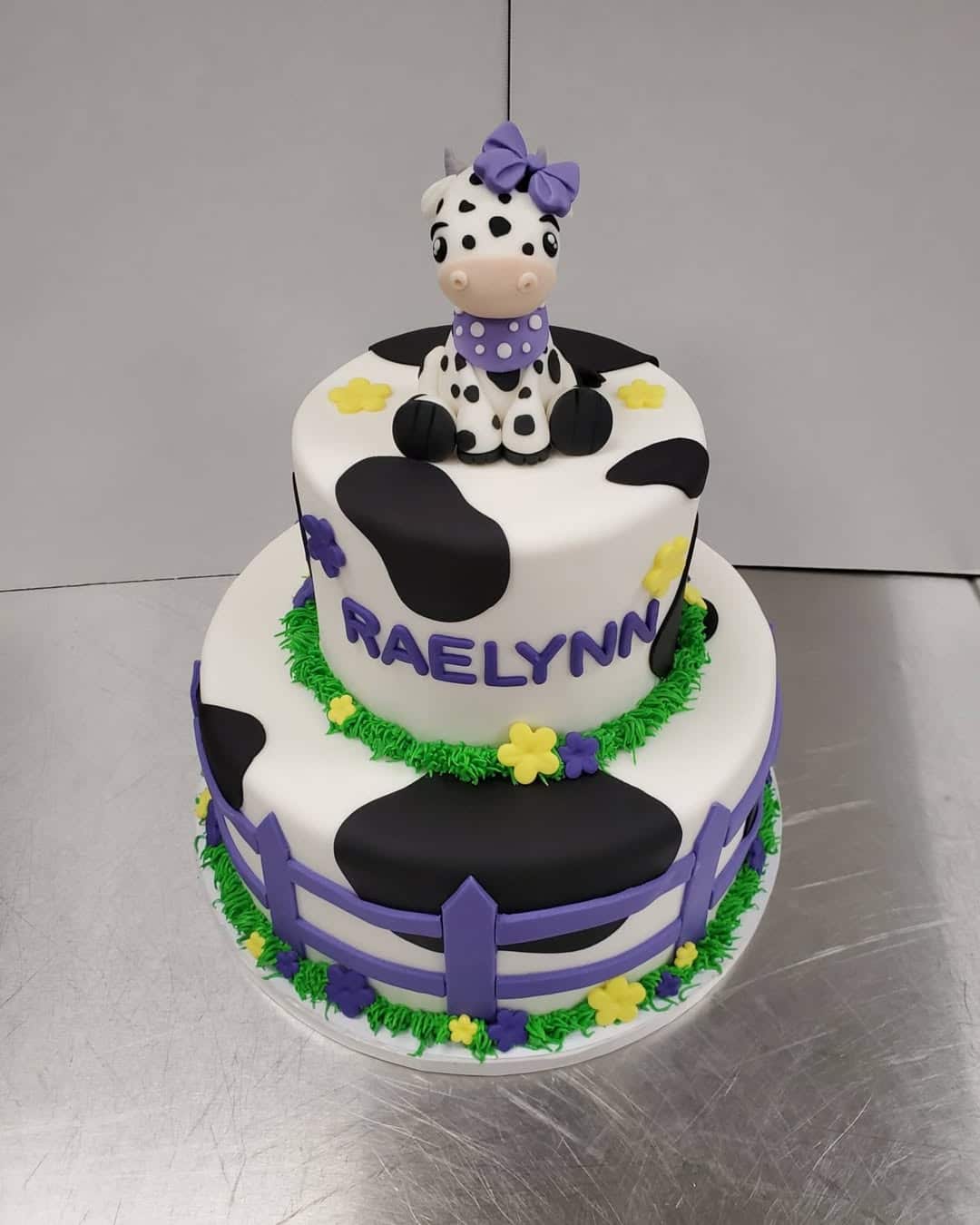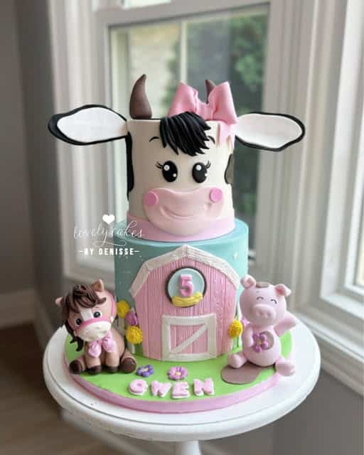 A multi-layer cake designed like a farm scene, with a fondant barn, grass, and little fondant cows grazing around. The cake layers can be decorated in green buttercream for fields, with 3D fondant fences and flowers. The cows can be cartoon-style or realistic, depending on the theme. You could even add other farm animals—pigs, chickens, or sheep—for a lively barnyard look. This cake works beautifully for children’s birthdays or farm-themed community events. It’s a fun, colorful design that allows for creativity with details and can be made as big or small as needed.