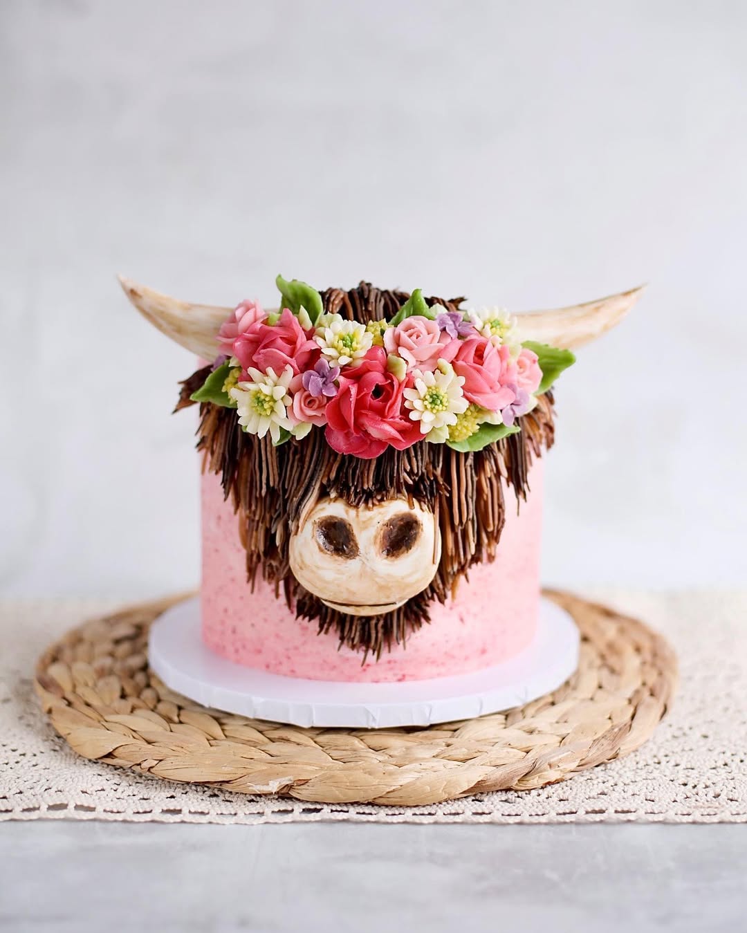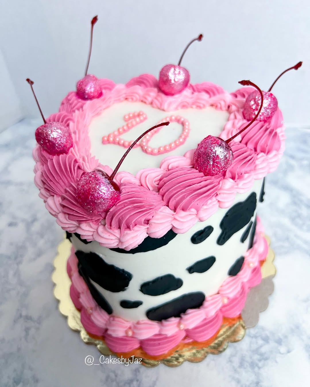 A round cake decorated to look like a cow’s face. White buttercream or fondant base, with black fondant spots, big fondant eyes, and a cute pink fondant muzzle with nostrils. The ears and small horns can be made from modeling chocolate or gum paste. Inside, you can use strawberry-flavored cake for a fun “pink nose” surprise when sliced. This design is cute and easy to customize—add a bow or flower crown for a girly touch, or make it more cartoonish for kids. Great for birthdays, baby showers, or farm-themed events.